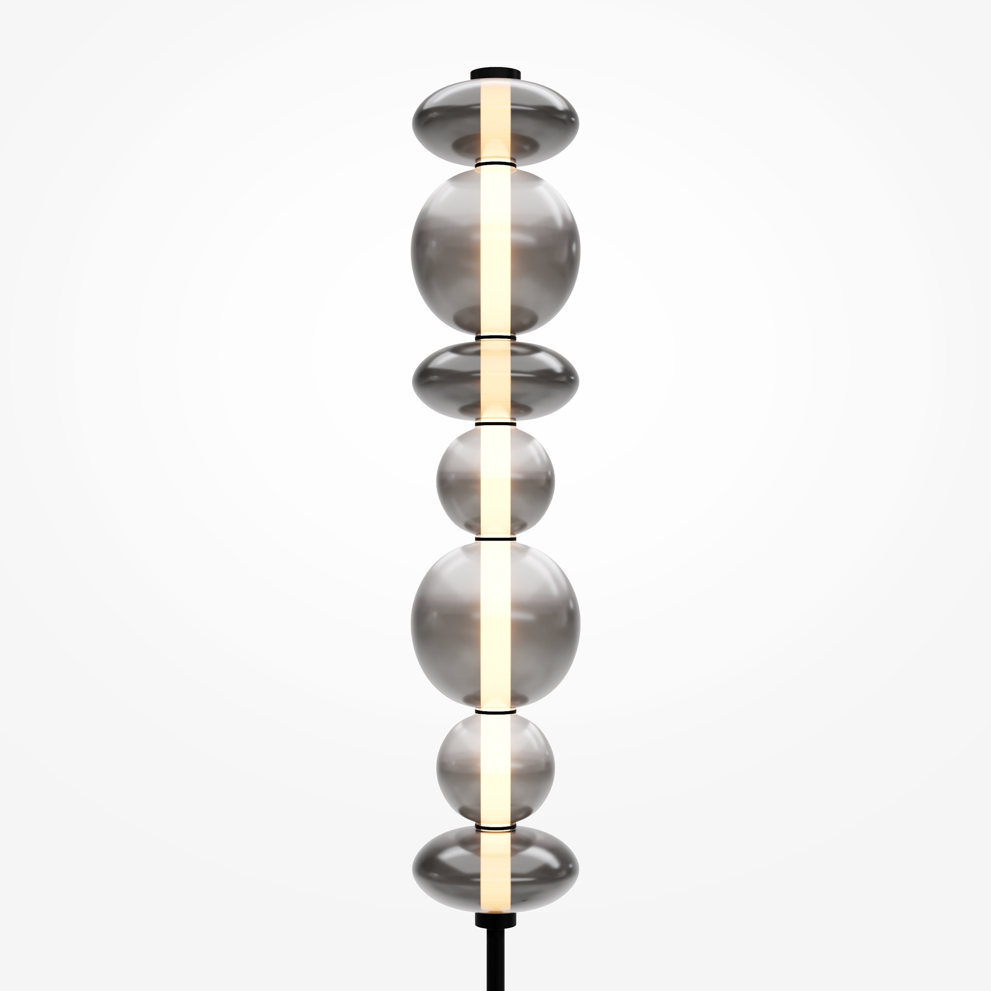 Светильники с тонированными выдувными стеклянными плафонами (дымчатыми или янтарными) и металлической арматурой (черной или цвета латуни). Окрашивание плафонов градиентное. Источник света: LED. Световой элемент установлен внутри акрилового рассеивателя. Цветовая температура источника света – 3000К, угол рассеивания — 120°. Торшеры снабжены Push-кнопкой на проводе.