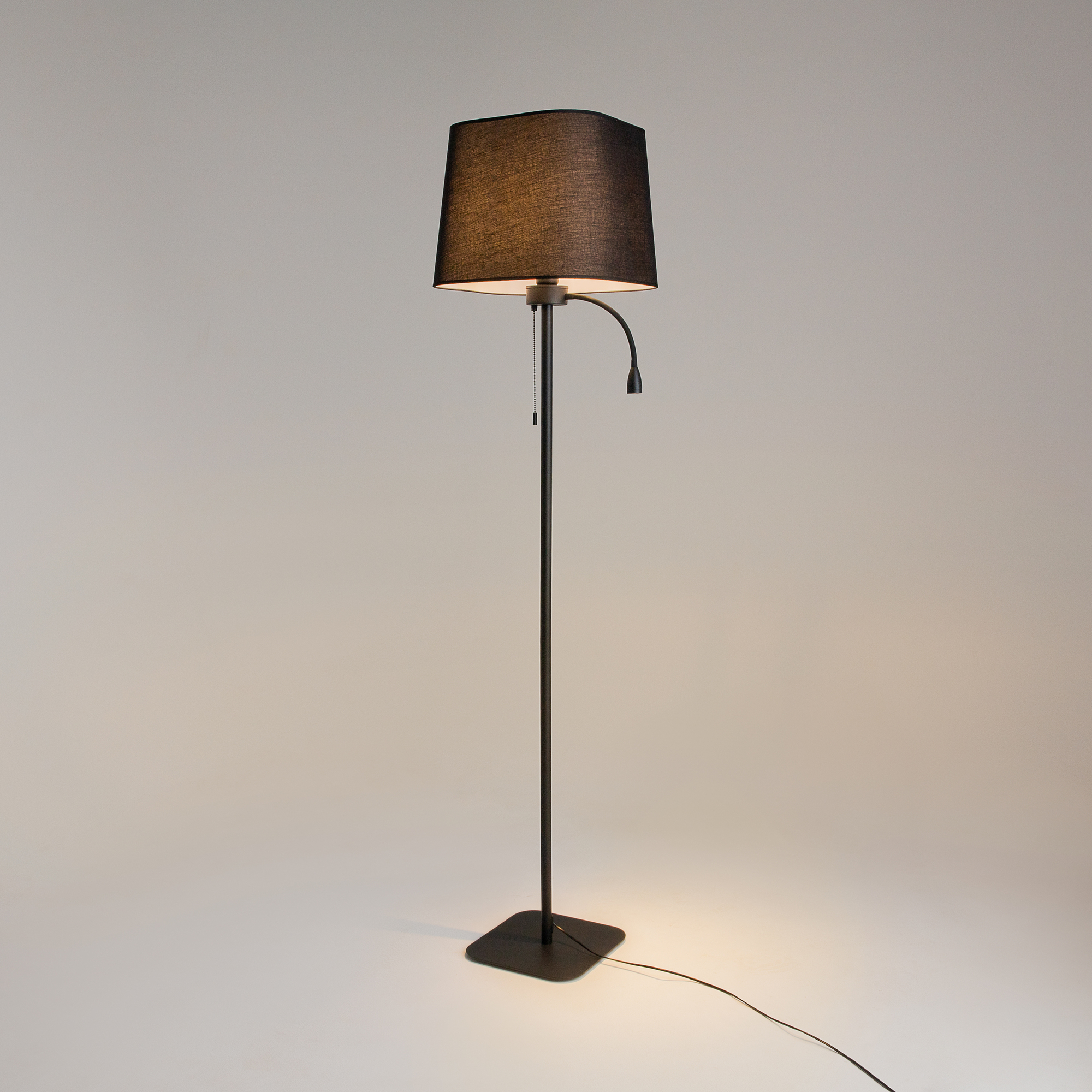 Металлическая арматура в белом и черном цвете. Материал абажура – текстиль, нанесенный на ПВХ, оттенки – белый и черный. LED-элемент для локальной под светки расширяет функционал модели.
