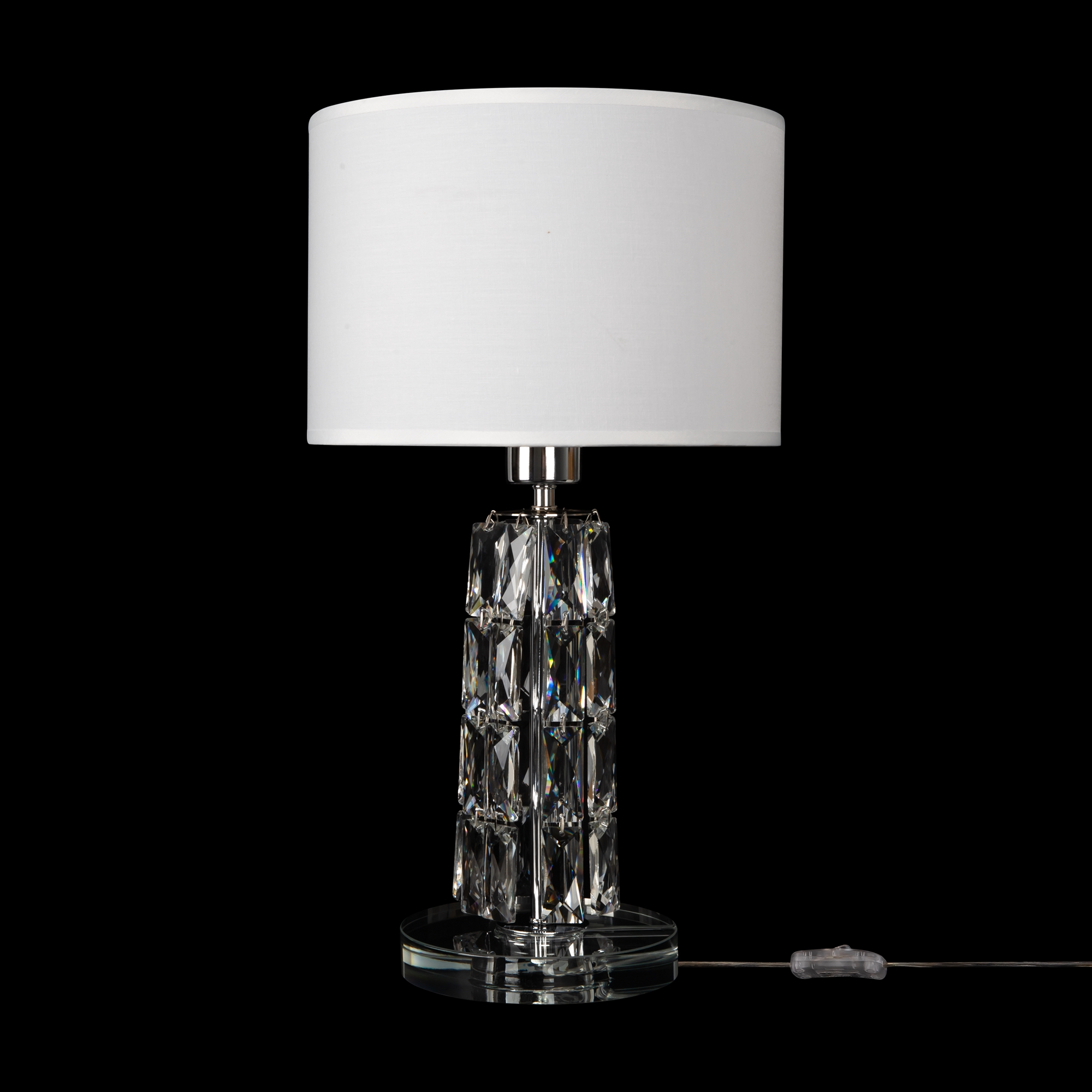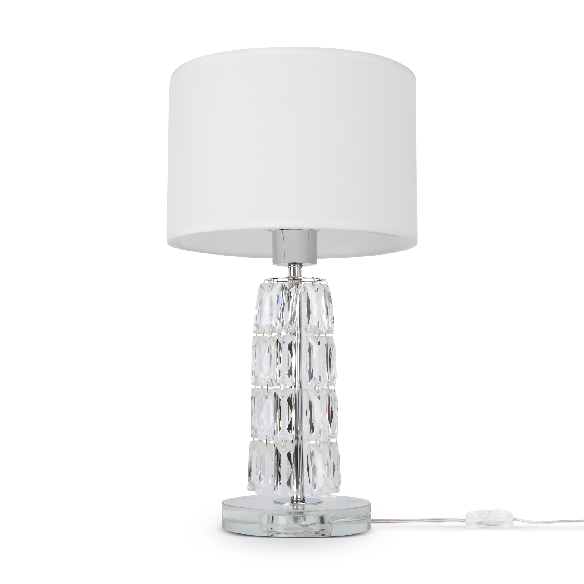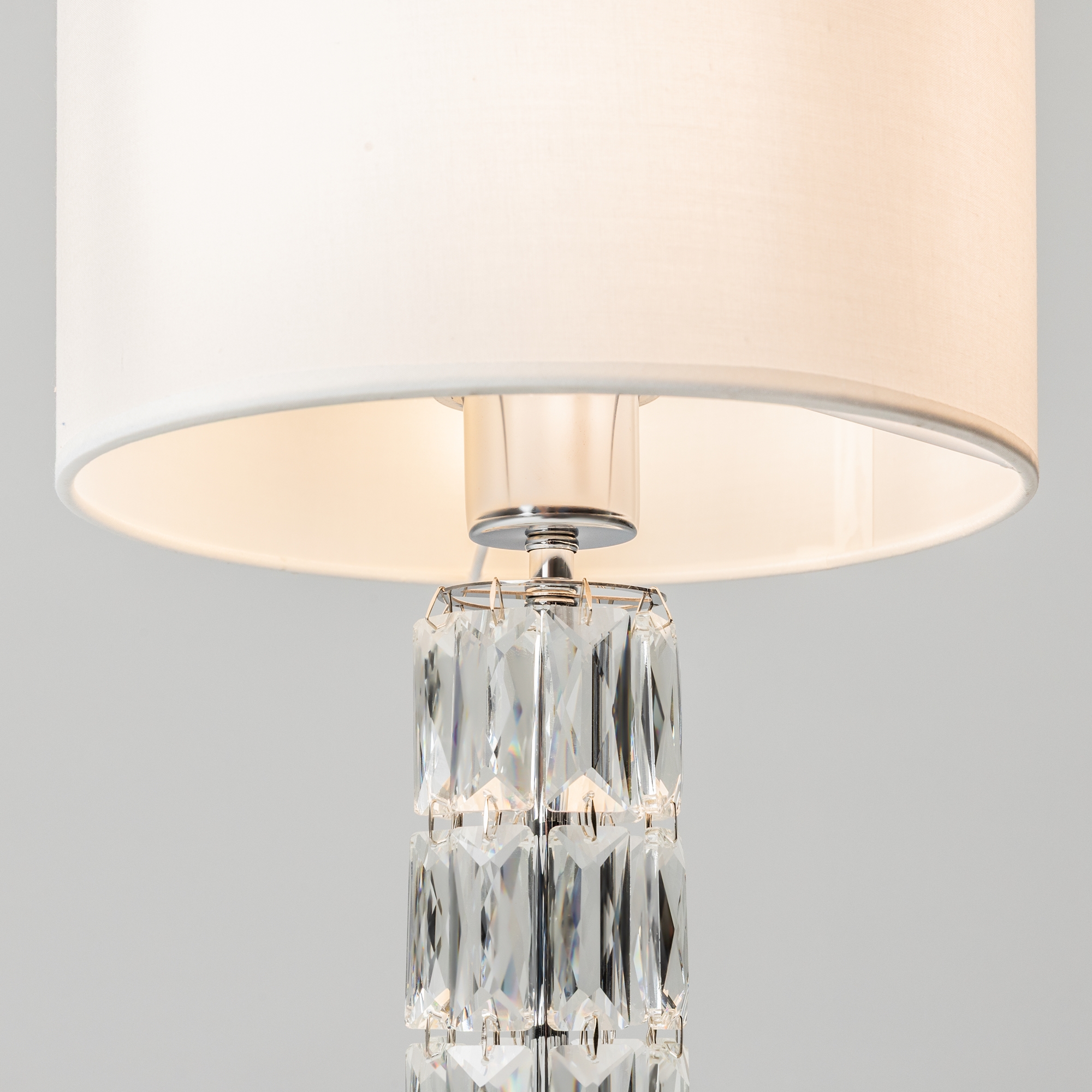 Арматура из металла, цвет – хром. Абажуры из текстиля, нанесенного на ПВХ. Цвет – белый. Декор – массивные кристаллы сложной огранки. Высота подвесных моделей регулируется.