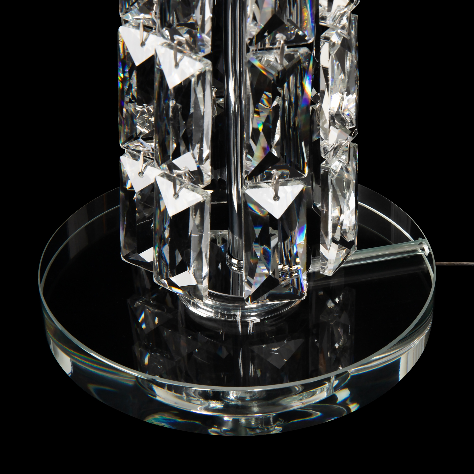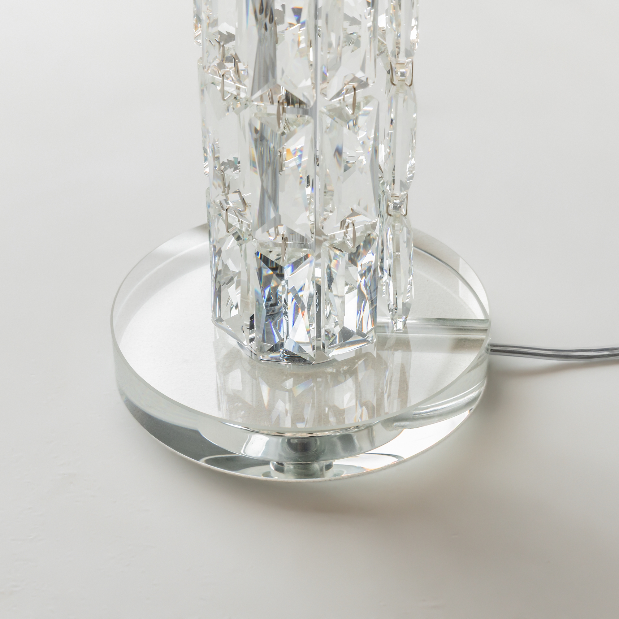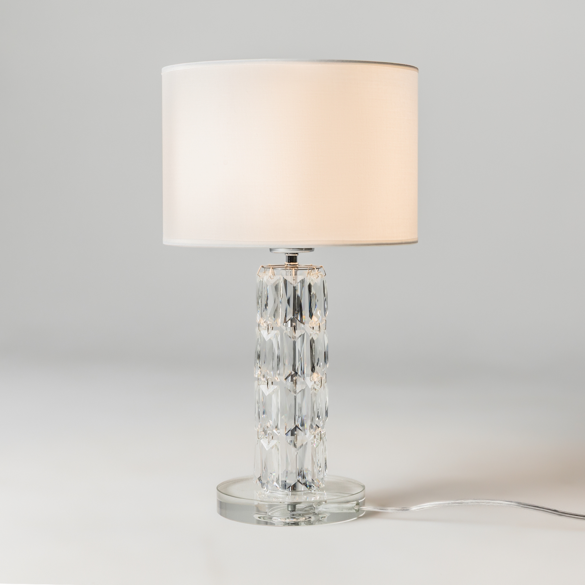Арматура из металла, цвет – хром. Абажуры из текстиля, нанесенного на ПВХ. Цвет – белый. Декор – массивные кристаллы сложной огранки. Высота подвесных моделей регулируется.