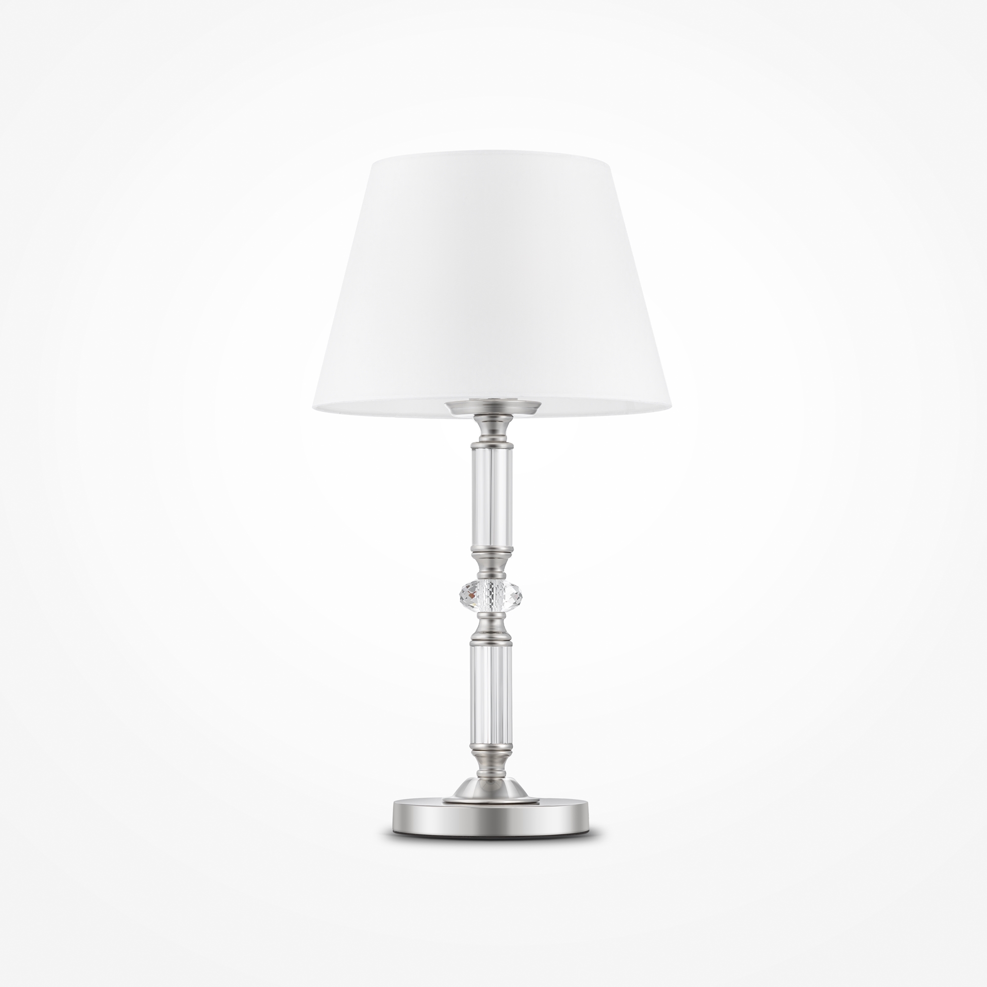 Материал арматуры – нержавеющая сталь, цвет – хром. Материал абажуров – текстиль на ПВХ, цвет – белый. Декор – прозрачное стекло. Акцентные стеклянные кристаллы на рожках со сложной огранкой.