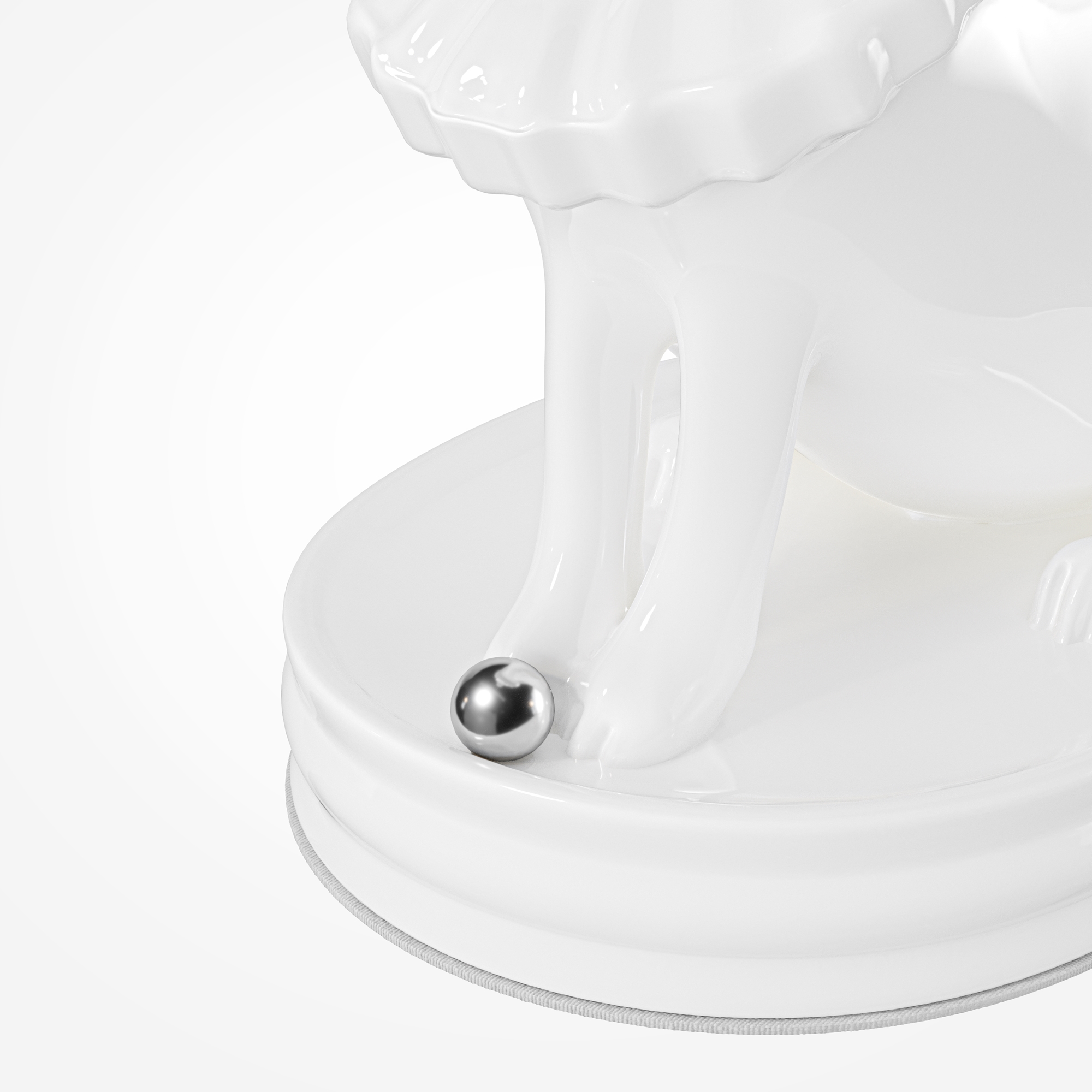 Фигурка капибары из натуральной керамики с молочно-белой глянцевой глазурью бережно держит металлический шарик — сенсорный выключатель. При касании шарика на голове животного загорается рельефный плафон из белого глянцевого стекла, рассеивающий тёплый свет LED-источника (3000К). Яркость свечения регулируется касанием сенсорного шарика на основании. Два варианта покрытия шарика — в цвете сатинированной латуни или глянцевой платины позволяет точно вписать светильник в цветовую гамму интерьера.