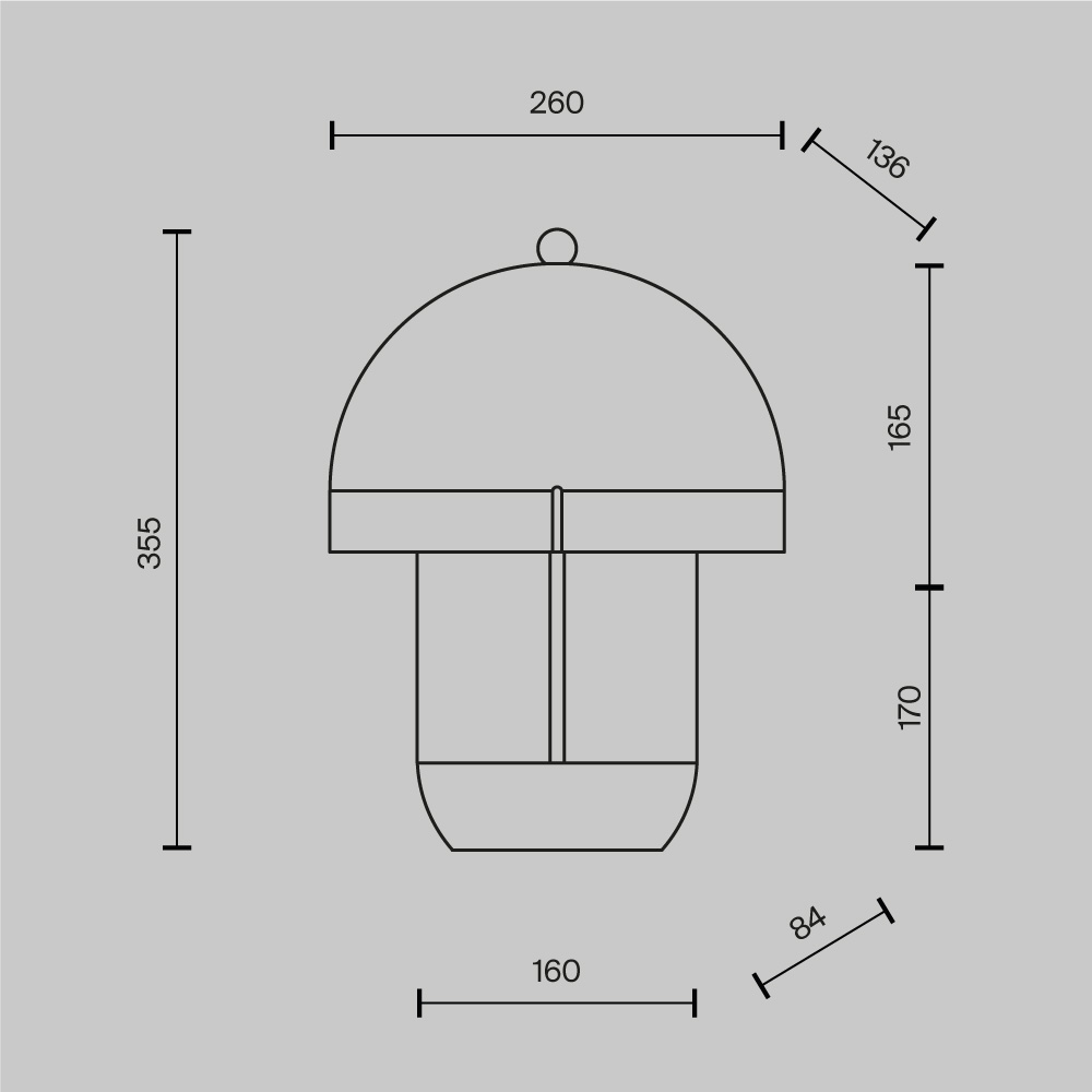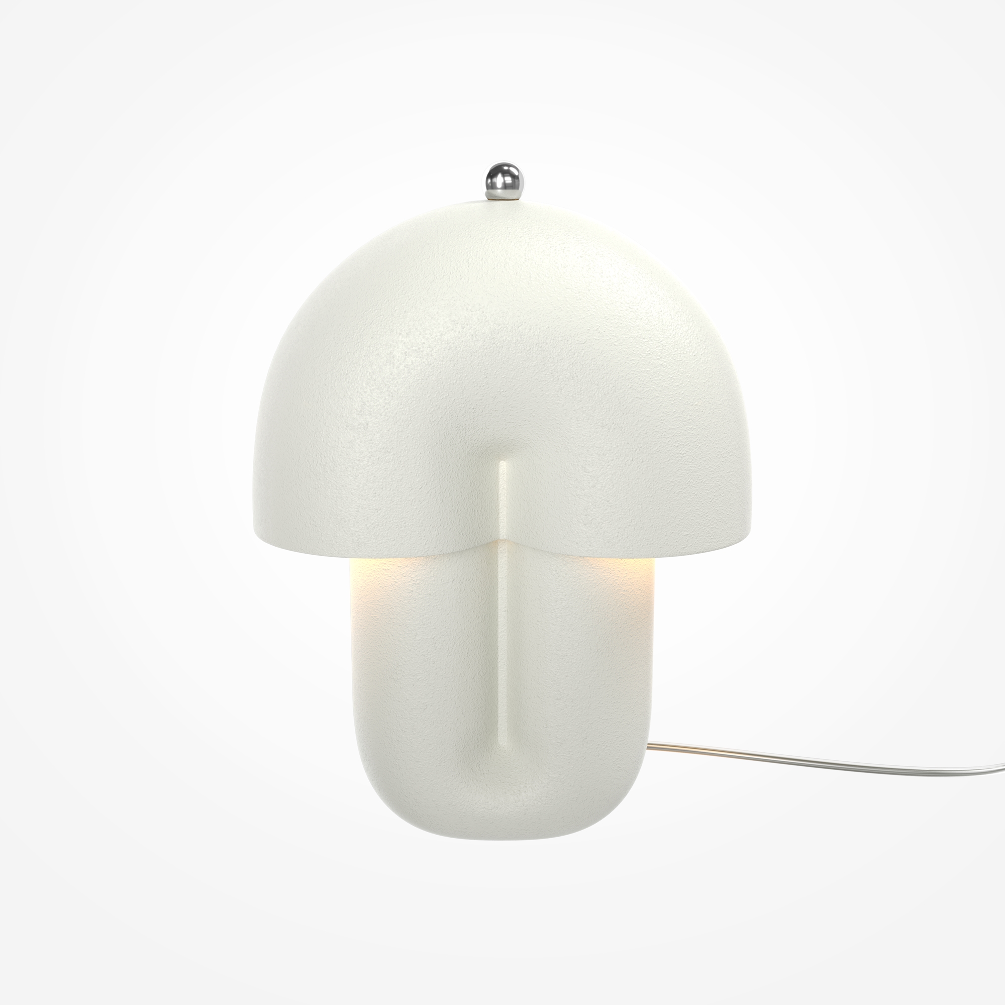 В основе дизайна — силуэт в форме «грибочка». Корпус светильника выполнен из натуральной керамики в трех цветах: шагреневый белый, глянцевые молочно-белый и нежный кашемир. LED-источник (3000К) с высокой световой отдачей (1400 лм) скрыт матовым акриловым рассеивателем и создает мягкий ореол под светильником. Сенсорный металлический шарик позволяет не только включать свет, но и регулировать его яркость. В комплекте предлагается два шара — в цвете сатинированной латуни или глянцевой платины.