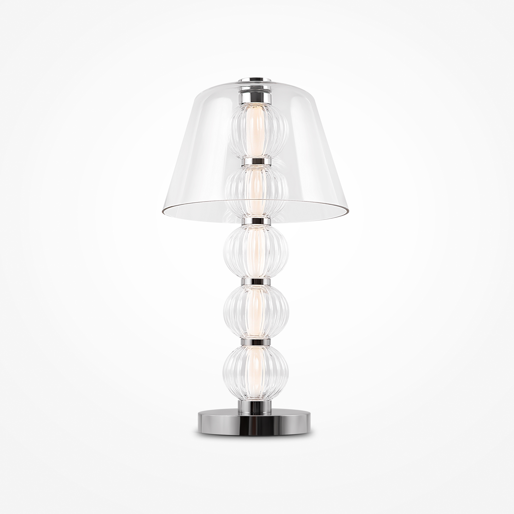 Арматура из металла, цвет – хром. Акцентный декор в виде рельефных сфер из литого стекла. Источник света – светодиодная лента – скрыта под акриловым рассеивателем. Регулируемая высота подвесных светильников.