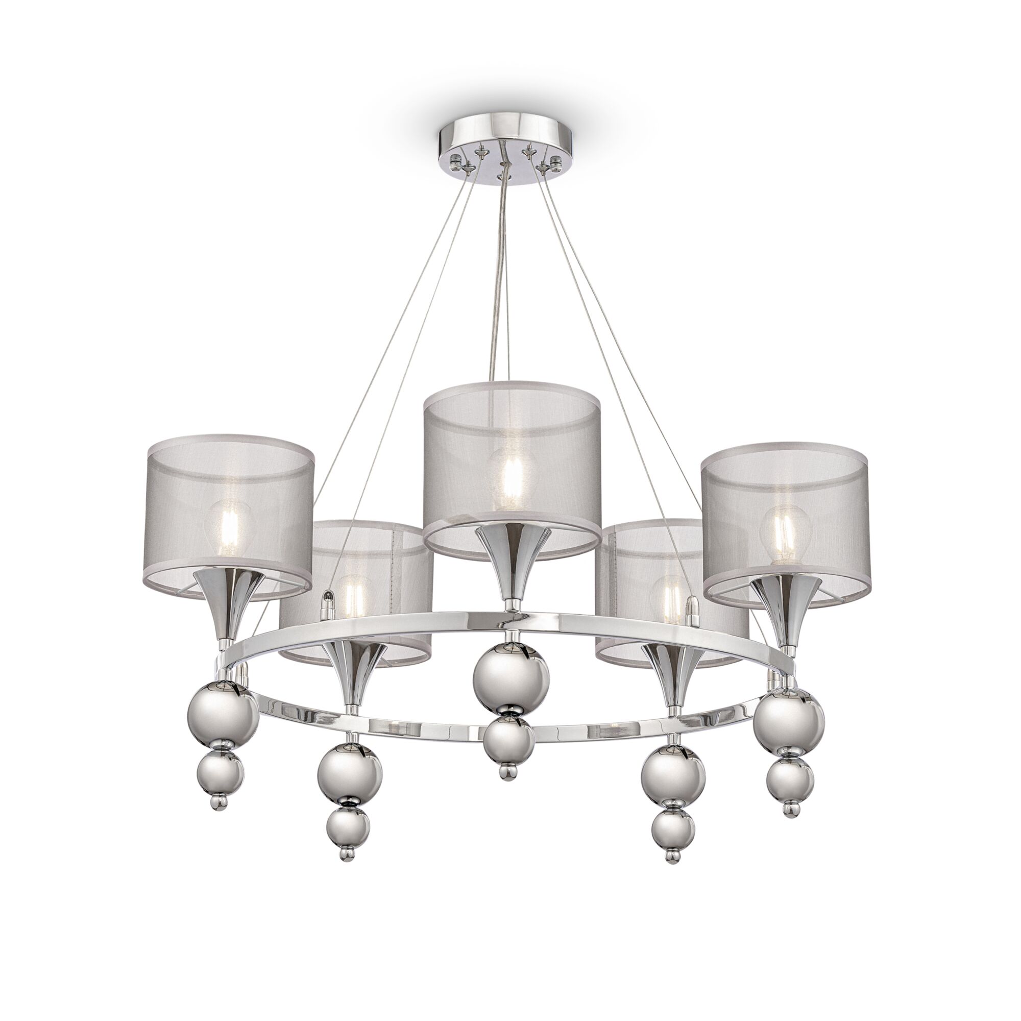 Материал арматуры – металл. Цвет – хром. Абажуры из полупрозрачной органзы серебристого оттенка. Декор – хромированные шары. Высота люстр регулируется. Одиночный подвес с цоколем Е27, лампа, бра, торшер и люстры – Е14.