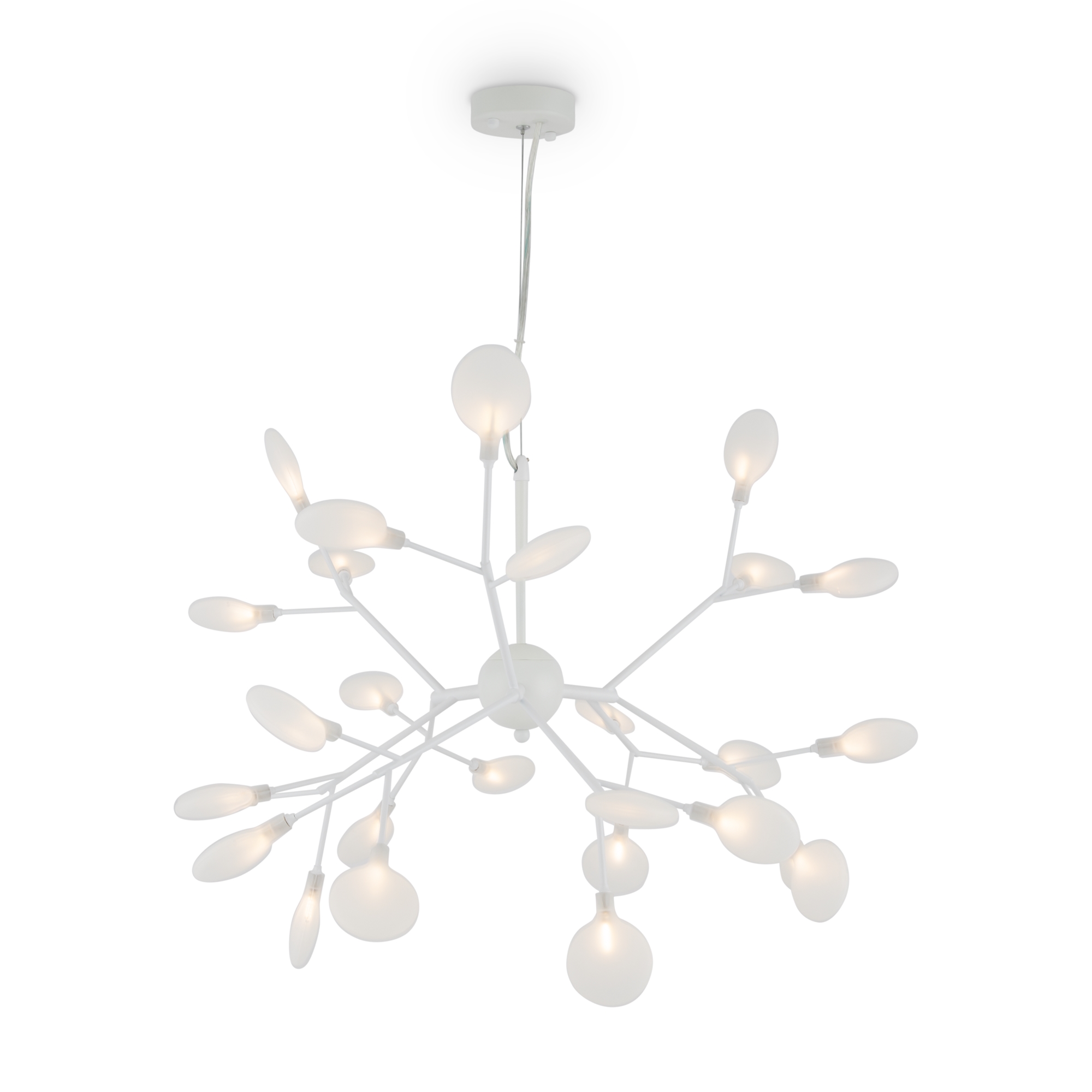 Материал арматуры – металл. Оттенки – черный, белый. Стеклянные плафоны оригинальной формы. Трендовый флористический дизайн. Источник света – лампа G4.