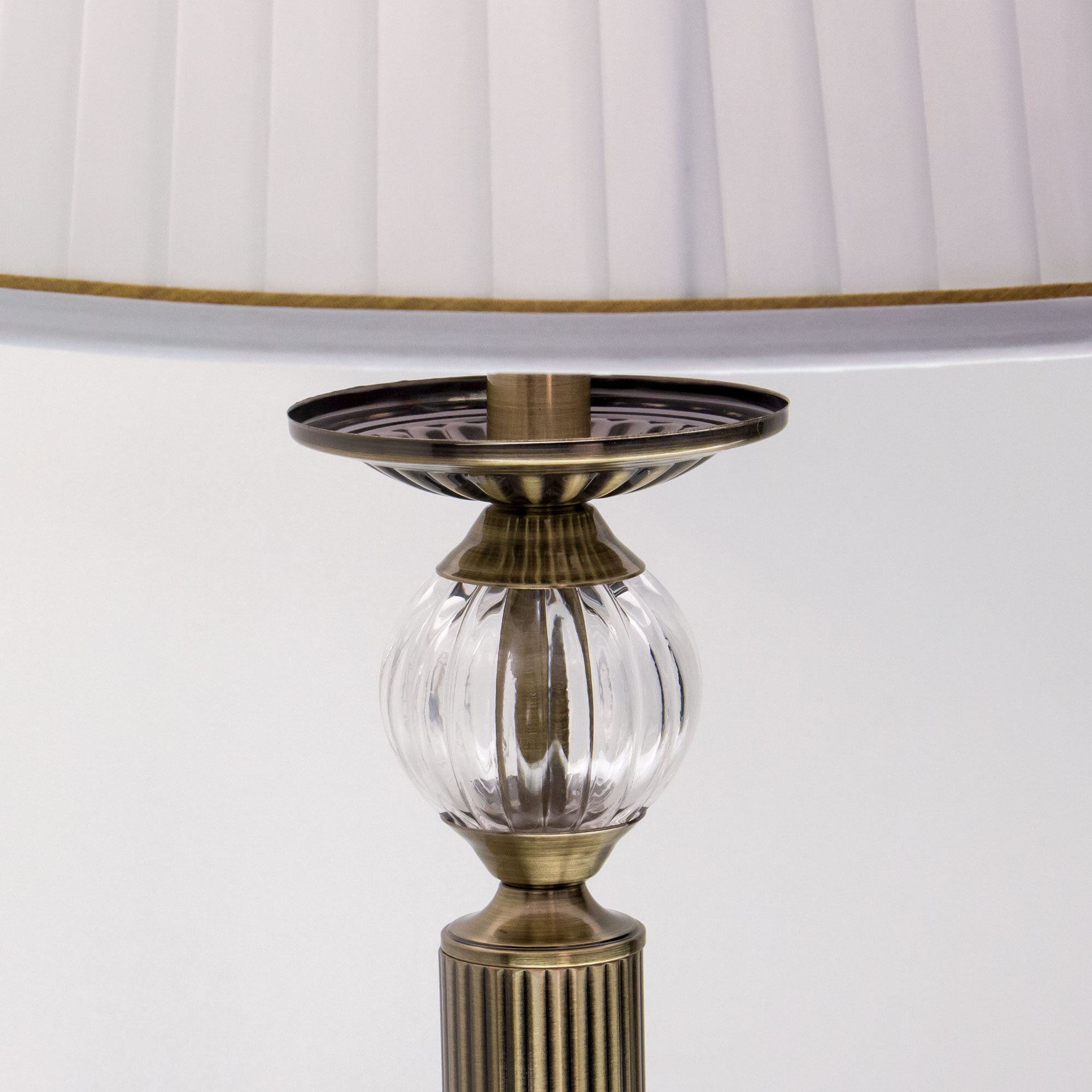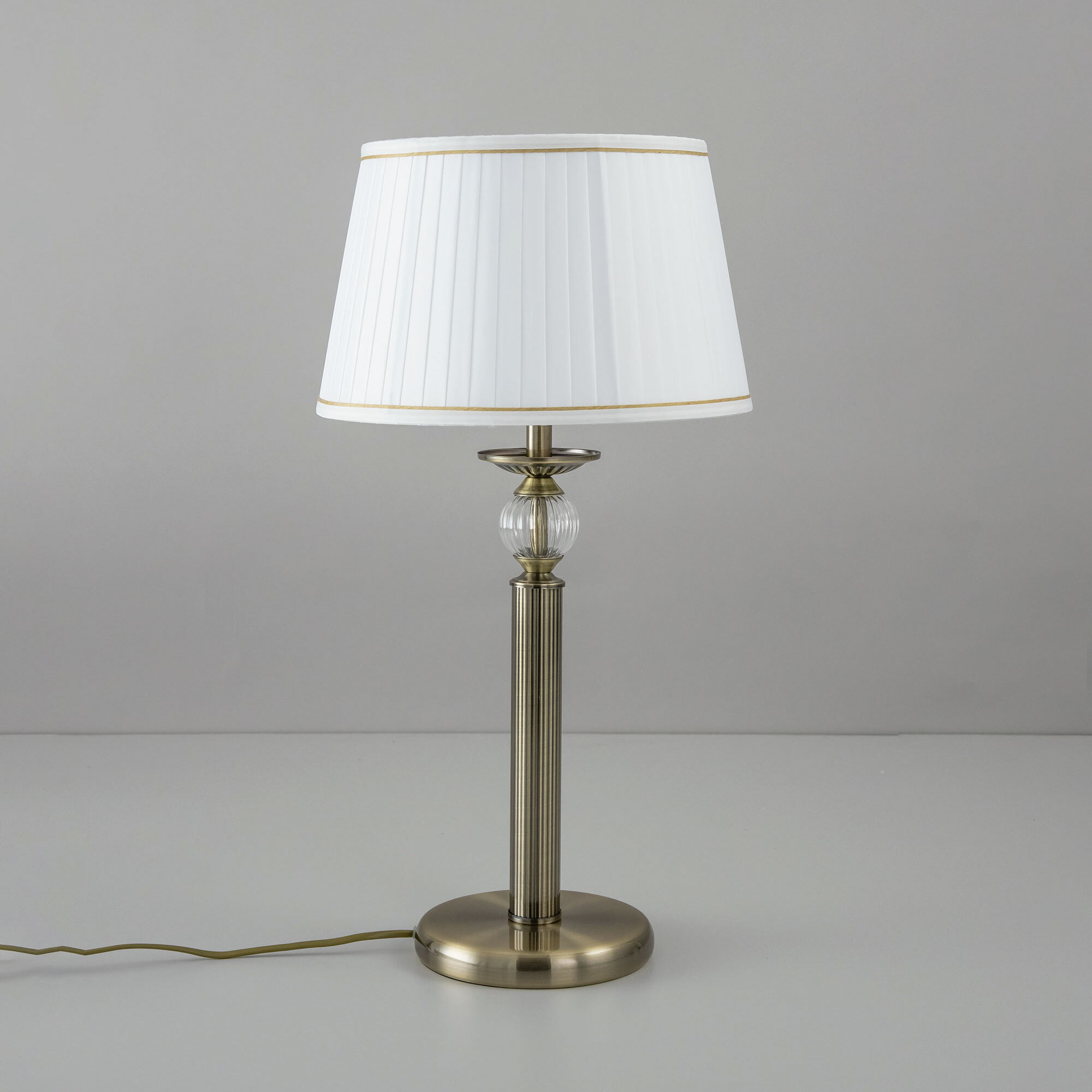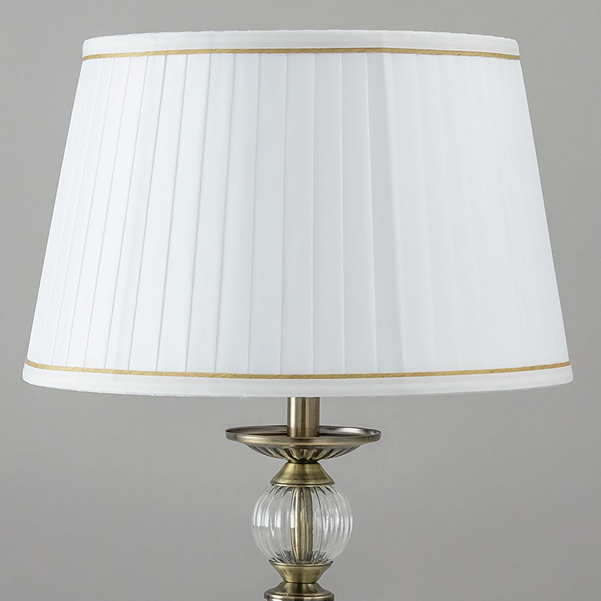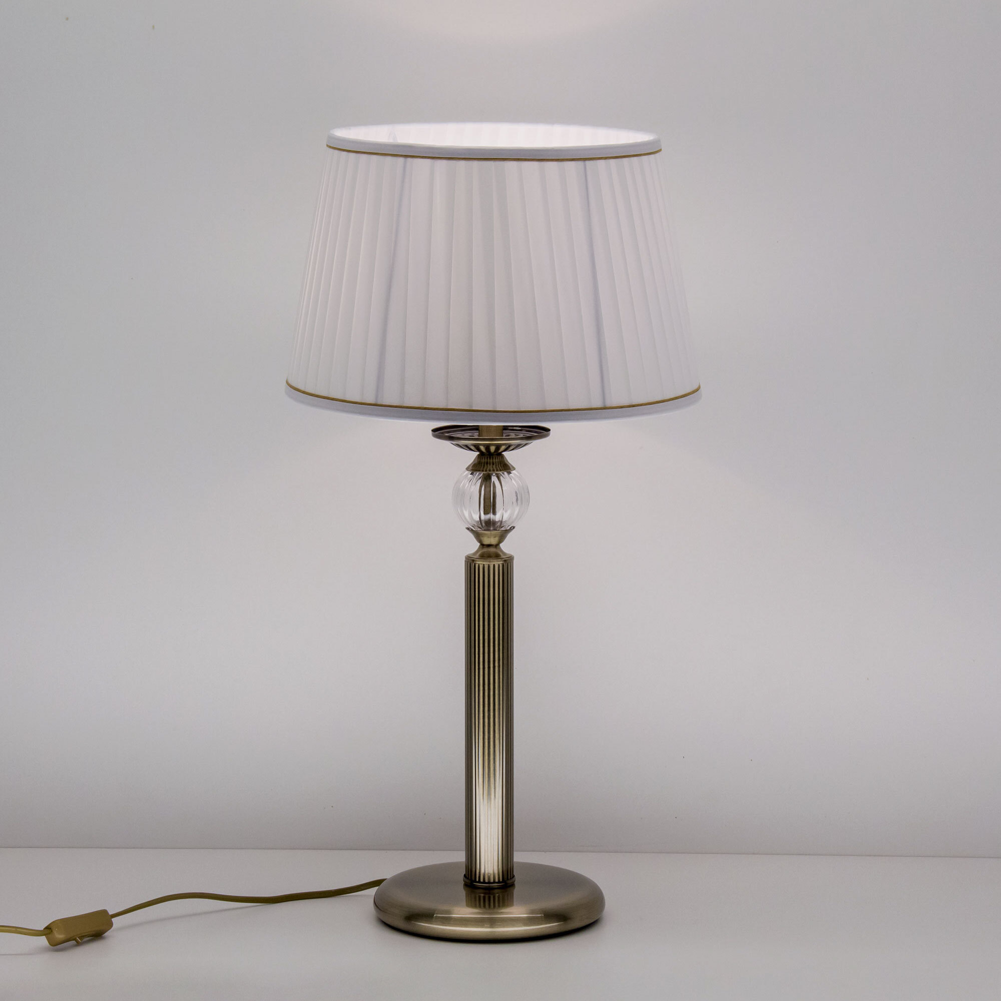 Элегантная настольная лампа Citilux Гера CL433813 выполнена в классическом стиле. Корпус металлический, благородного бронзового цвета. Стройная рифлёная стойка изыскано декорирована прозрачным рельефным стеклянным шаром. Тканевый абажур из плиссированного атласа белого цвета окантован изящной тесьмой.