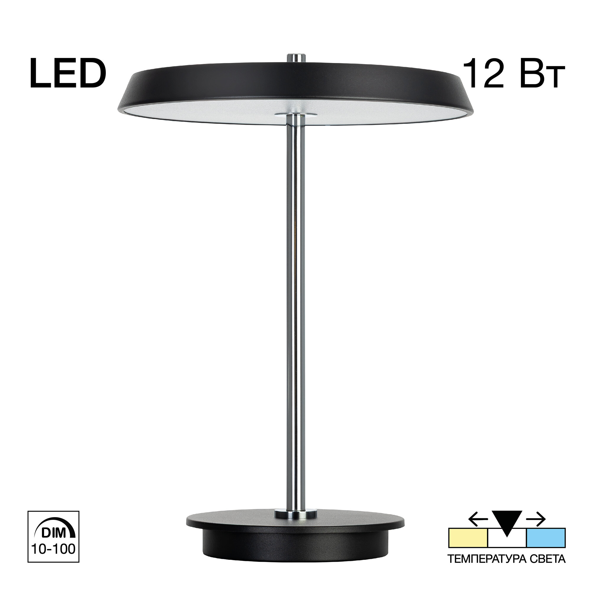 Мощность изделия 12Вт. Диммер с плавной регулировкой яркости от 10 до 100% позволяет выбрать оптимальный уровень освещения. Цветовая температура регулируется, доступны три варианта - 3000-4000-6000К (тёплый, нейтральный, холодный свет). Модель с памятью режима света. Кнопка выключателя оснащена подсветкой. Длина сетевого провода 1,8м.