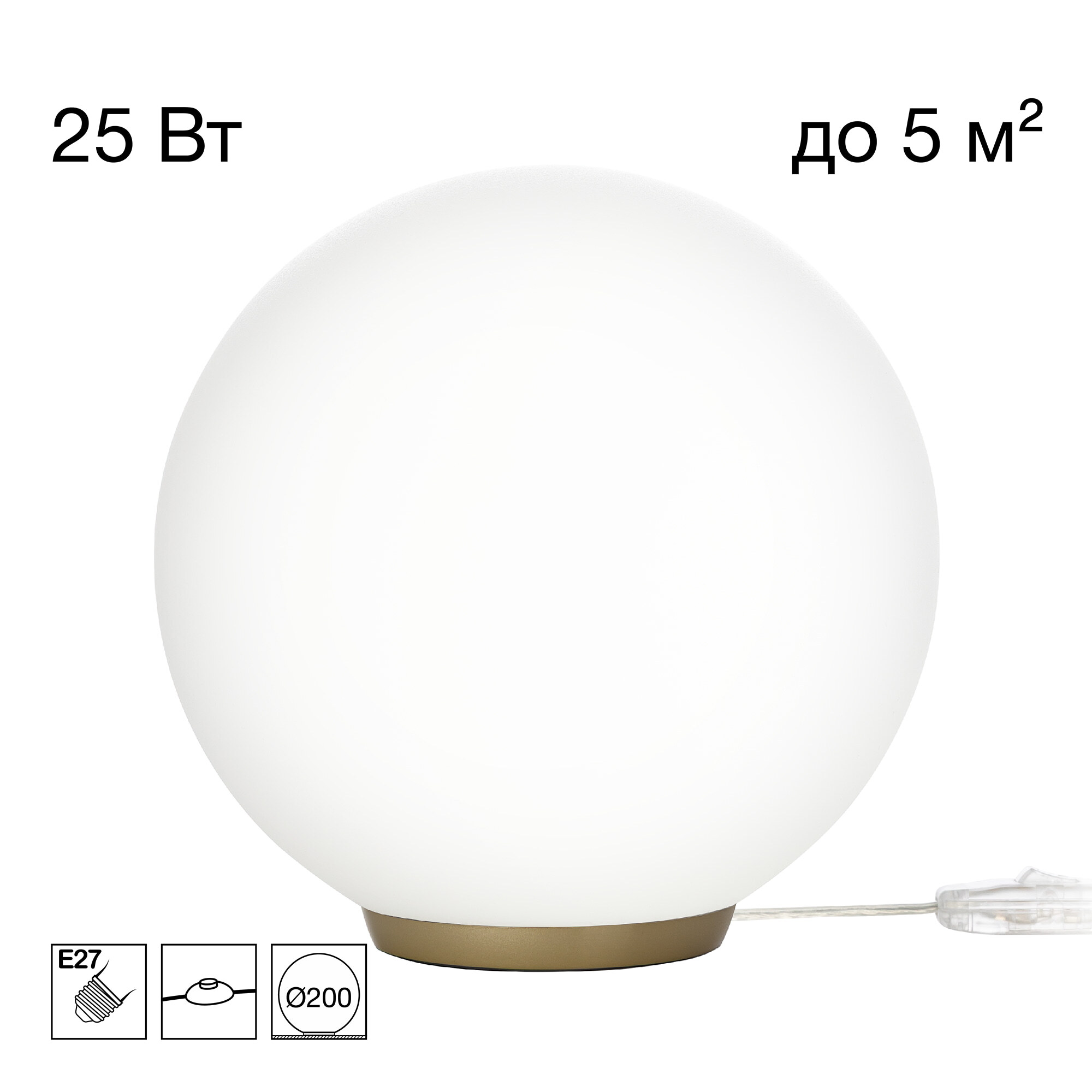 На золотистом основании высотой 12мм из высокопрочного полимера располагается белый матовый плафон-сфера диаметром 20см, изготовленный из специализированного оптического полимера. Удобный выключатель располагается на проводе.