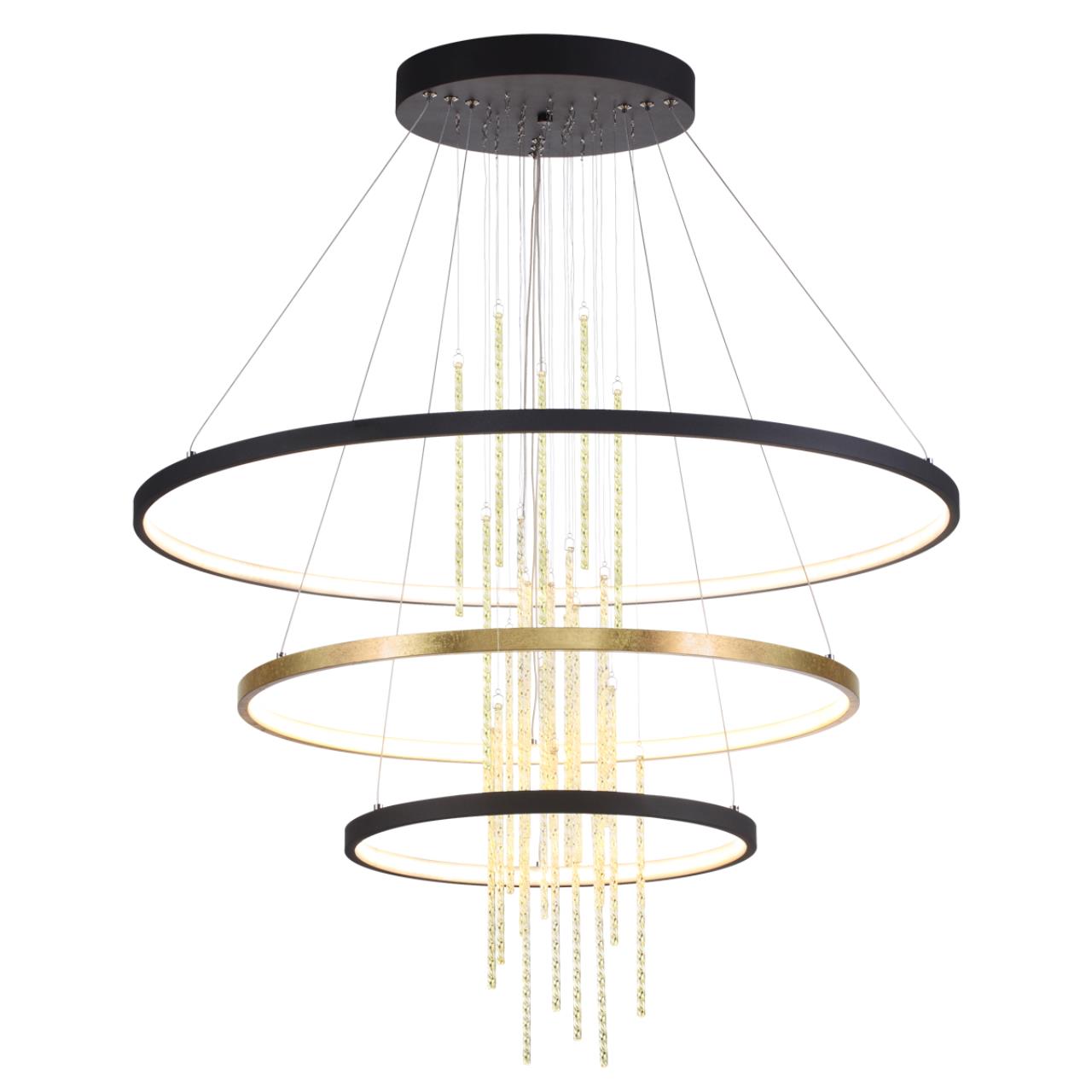Линия Monica сочетает в себе роскошь и гламур золотого цвета, выполненного в технике фольгирования, и... гармонию музыки ветра: каскад стеклянных трубочек в центре светильников при касании будет издавать легкий и приятный, словно шелест, звук. Подвесы могут состоять из двух и трех колец, в линии теперь есть потолочный светильник.