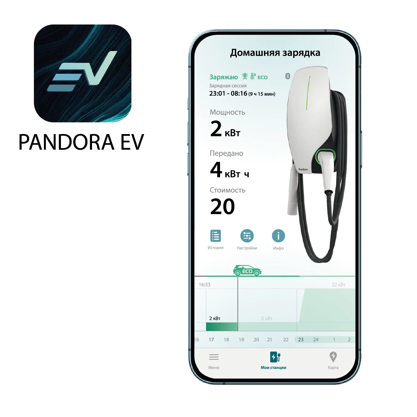 Удобная настройка, мониторинг и управление зарядной станцией через Bluetooth- мобильное приложение, и возможность объединить в единую домашнюю сеть несколько станций по Ethernet.