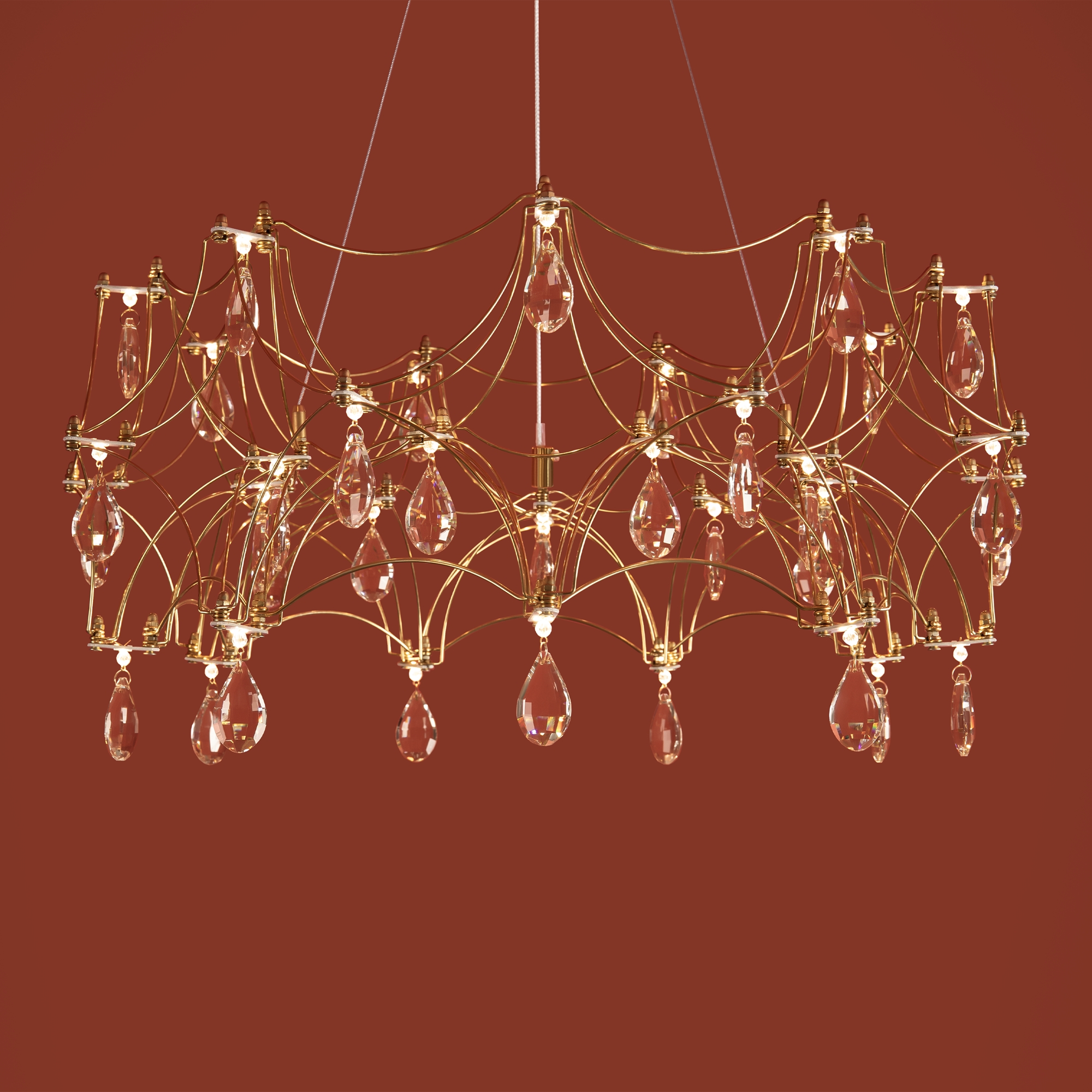 Воздушная конструкция с хрустальными капельками. Металл искусно изогнут и переплетен, образуя причудливый узор. Внутри этой металлической паутины расположены миниатюрные LED источники.