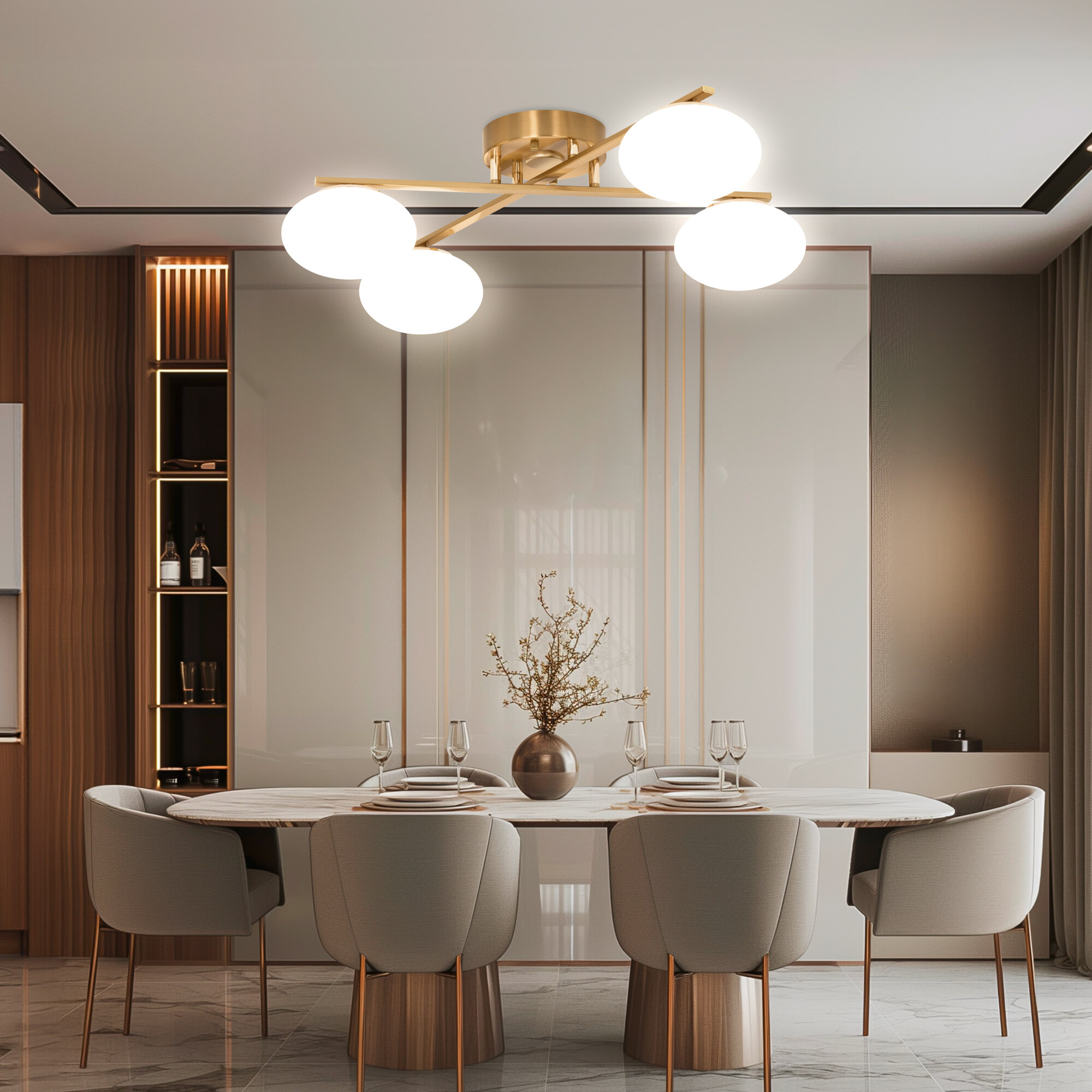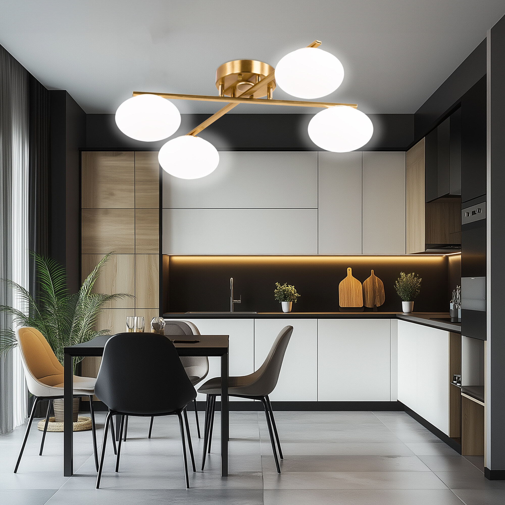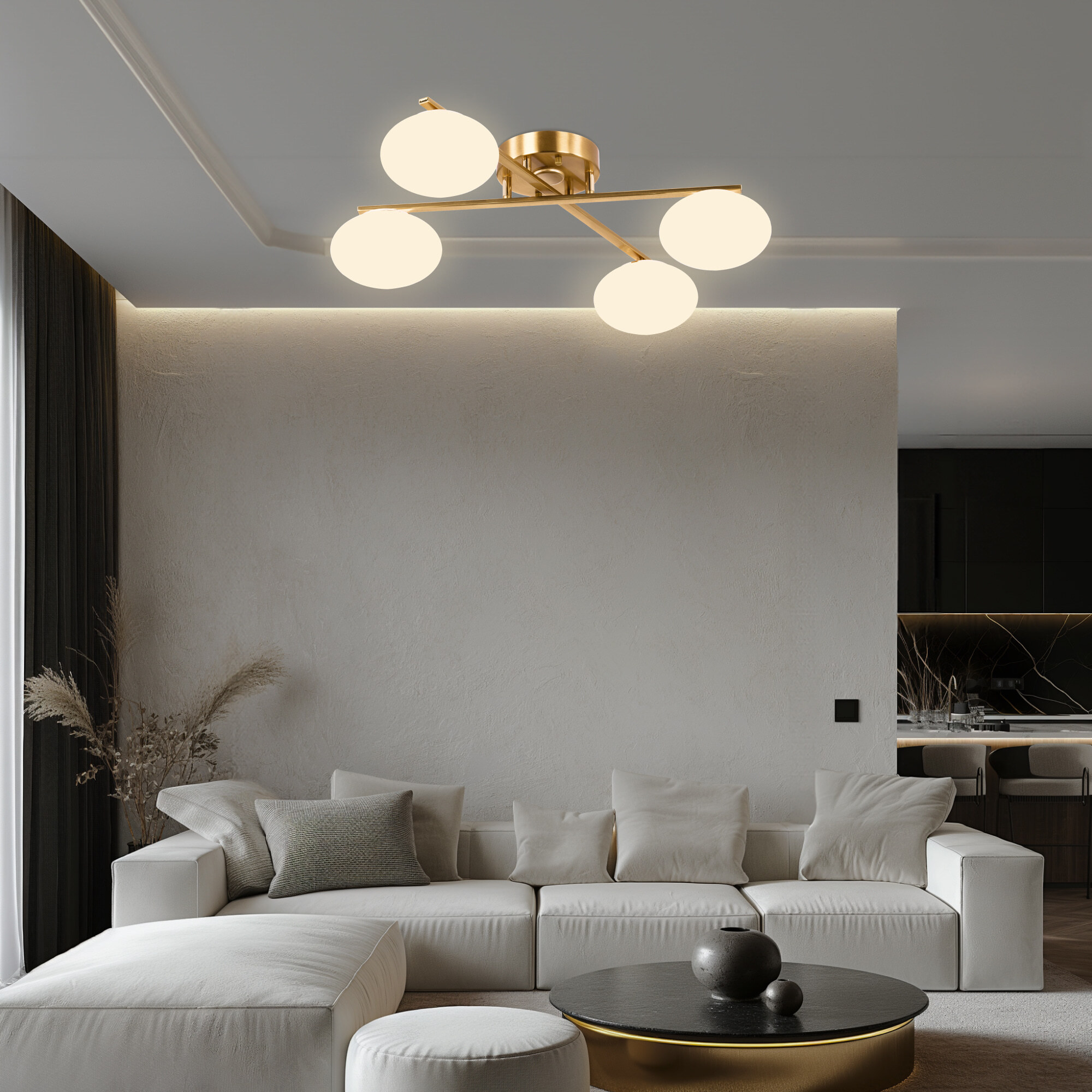 Люстра четырёхрожковая с круглым основанием, корпус металлический, цвет благородная бронза. Плафоны в форме сфероида изготовлены из матового оптического полимера. В каждом плафоне находится уникальный светодиодный модуль, который обеспечивает яркое основное освещение или красочную RGB-подсветку с плавной регулировкой яркости во всех режимах света.