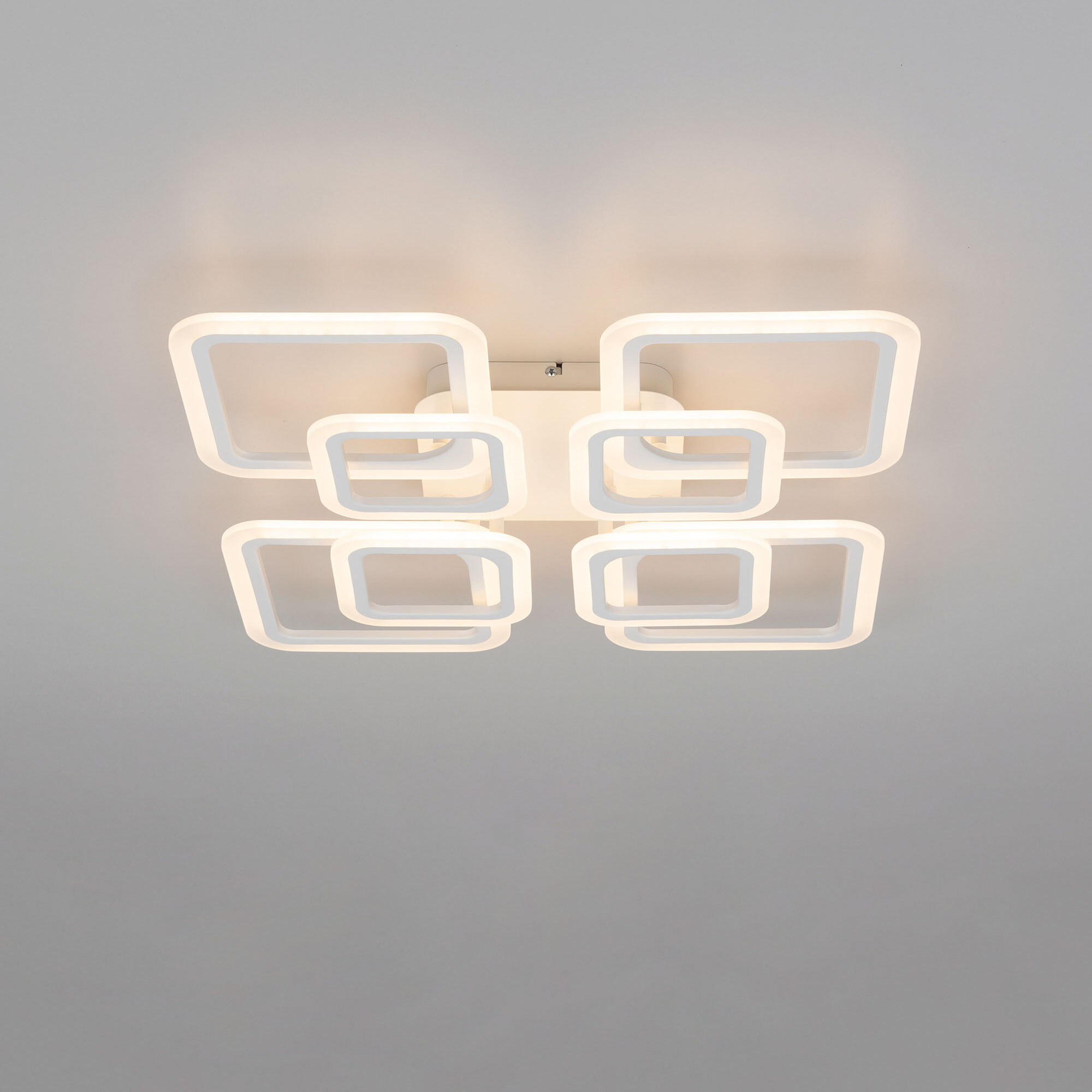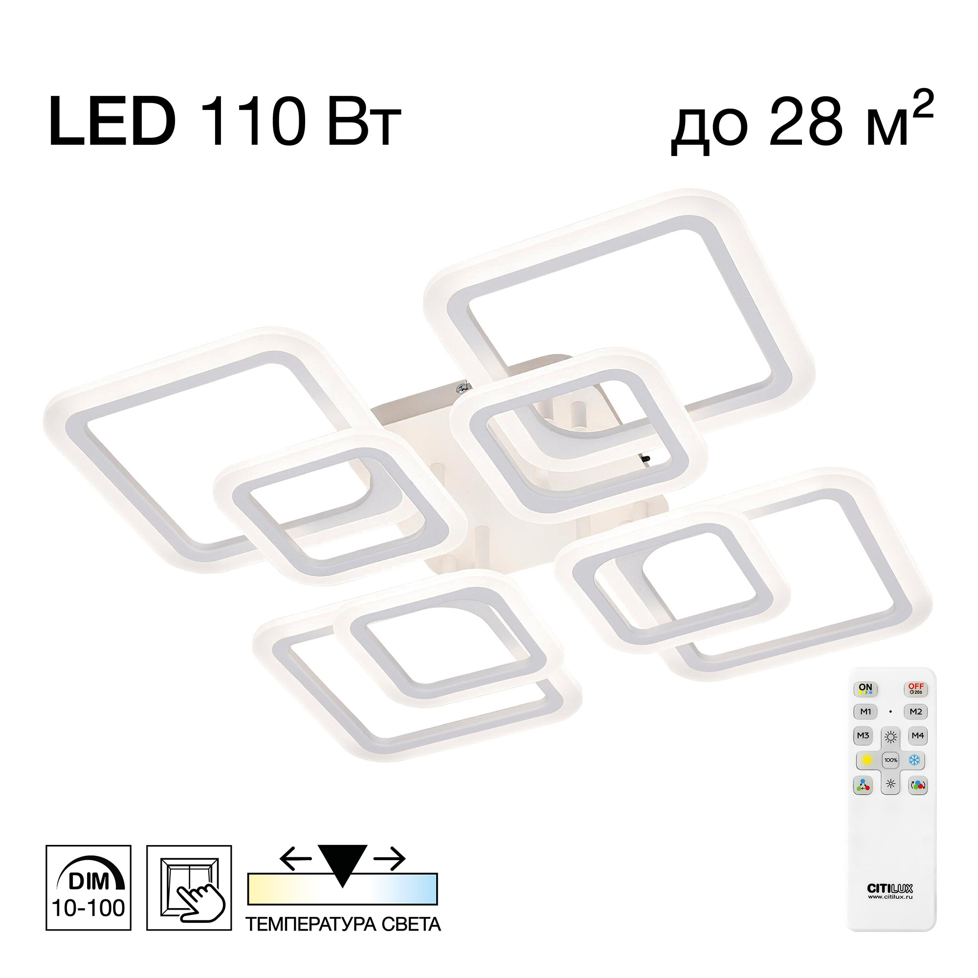 Светодиодная потолочная люстра Citilux Марсель CL232180R с пультом дистанционного управления. Металлическое основание и восемь светодиодных модулей плафонов, формирующих внешний вид люстры, имеют квадратную форму. Корпус плафонов металлический, рассеиватель из оптического полимера. Люстрой можно управлять с помощью пульта дистанционного управления и настенным выключателем. Изделие оснащено яркими светодиодами, с возможностью плавной регулировки яркости от 10% до 100%. Цветовая температура регулируется в диапазоне от 3000К до 5500К, позволяя настроить любые оттенки теплого, нейтрального или холодного света, без мерцания и пульсаций. Есть настраиваемые режимы памяти и таймер выключения. Модель подходит для всех типов потолков, в том числе натяжных, тип крепления – планка. Пульт ДУ в комплекте, тип батареек ААА (батарейками не комплектуется). Люстра плоская – высота всего 11см, размер 60х60см, мощность 110Вт, световой поток 11000Лм.Citilux CL232 MARSEL: Вдохновение в каждом луче.