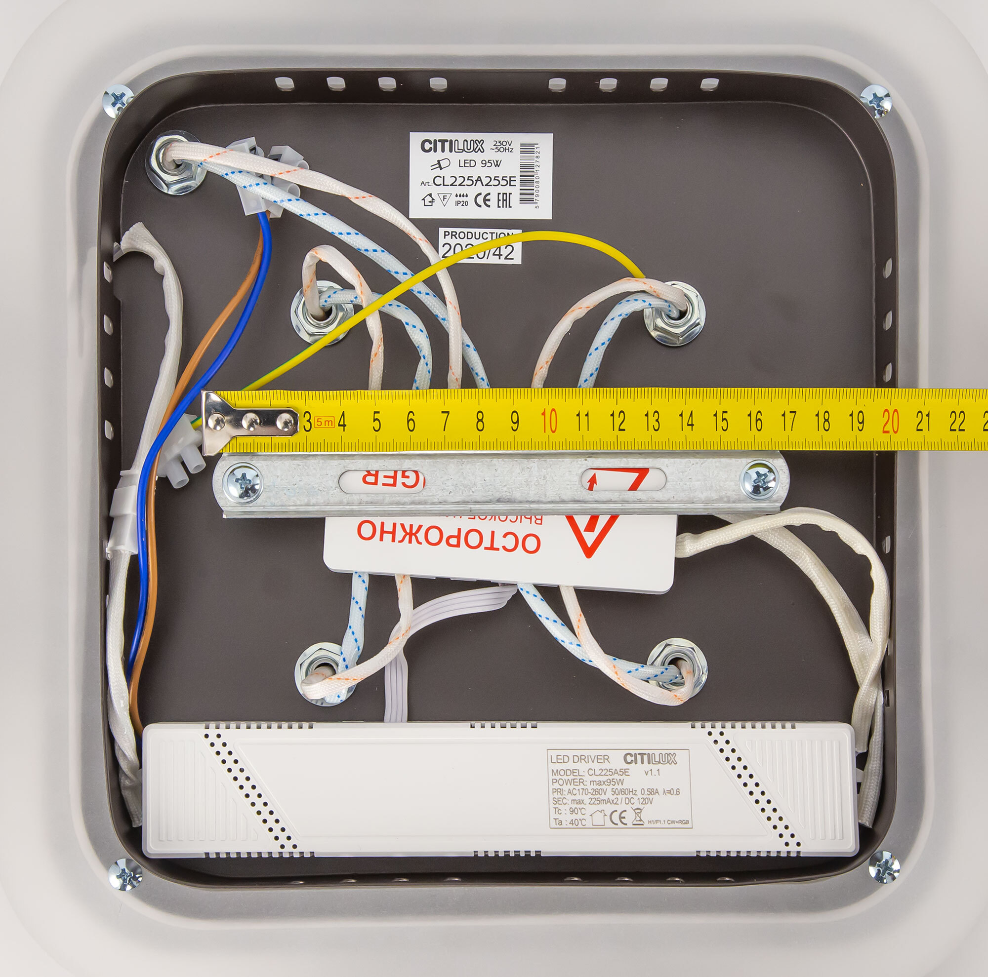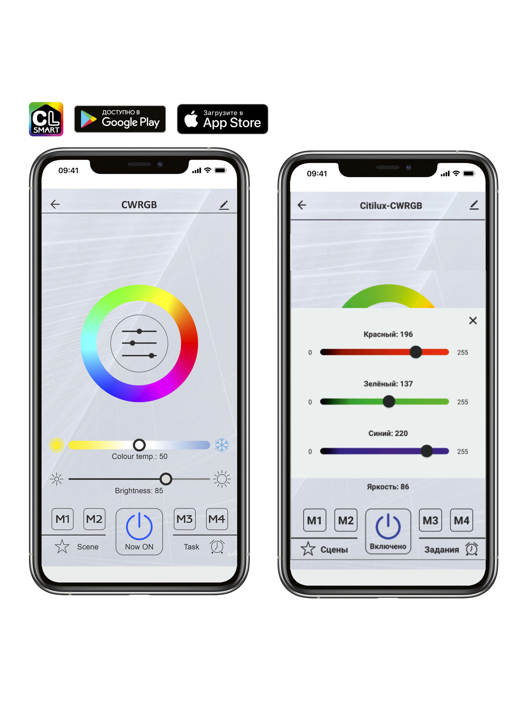 Модель оснащена мощными светодиодами, с возможностью плавной регулировки яркости от 10 до 100%. Цветовая температура регулируется в диапазоне от 3000К до 5500К, позволяя настроить любые оттенки теплого, нейтрального или холодного света. В основании светильника установлена независимая цветная подсветка RGB. Мощность люстры 80Вт, 6400Лм, площадь освещения при стандартной высоте потолков до 22 м². Пульт ДУ в комплекте, тип батареек ААА (батарейками не комплектуется).