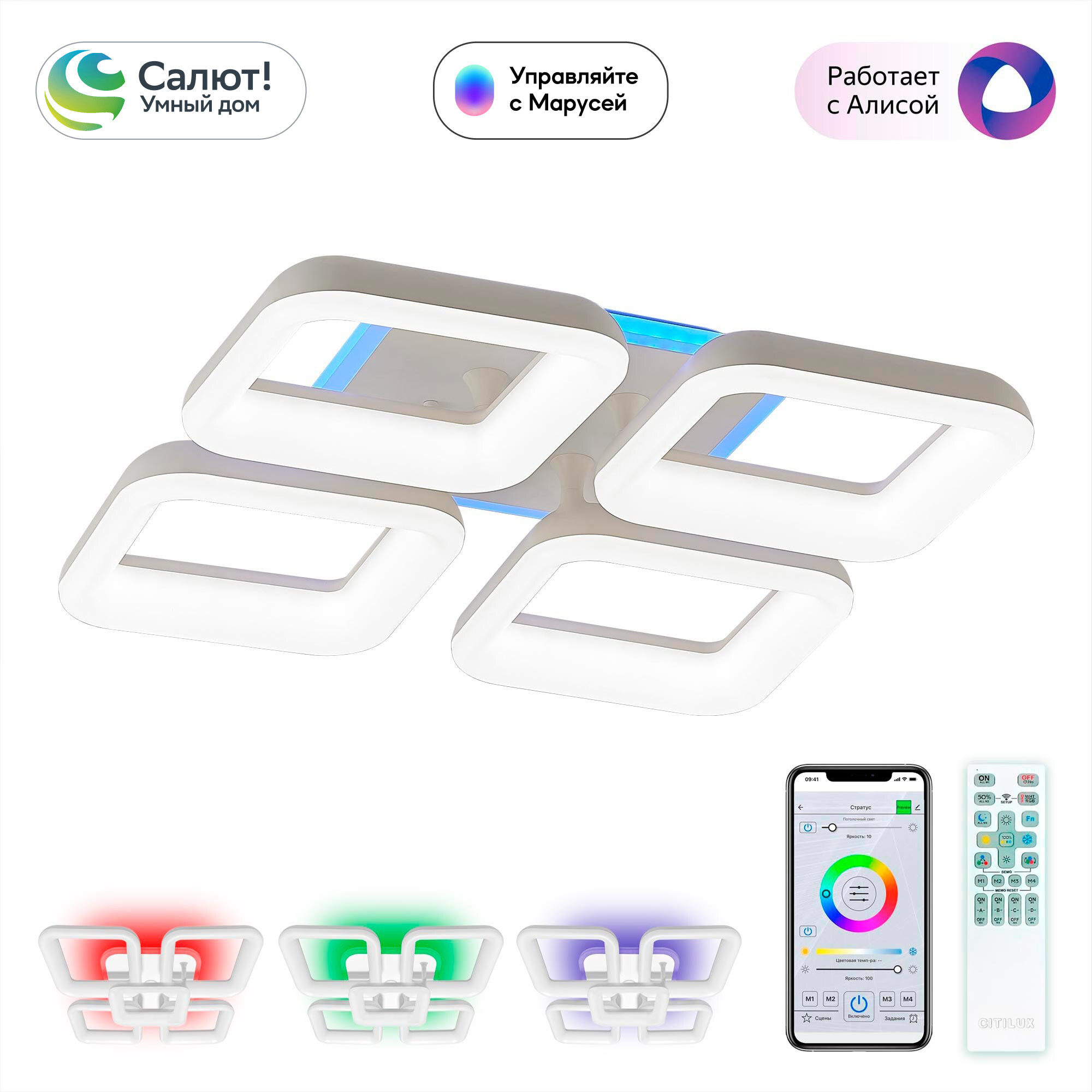 Люстрой можно управлять: из приложения на смартфоне по Wi-Fi при наличии интернета, с помощью голосовых помощников Алиса и Маруся, есть возможность запуска настроенных сценариев с помощью Сири, а также пультом дистанционного управления и с настенного выключателя.