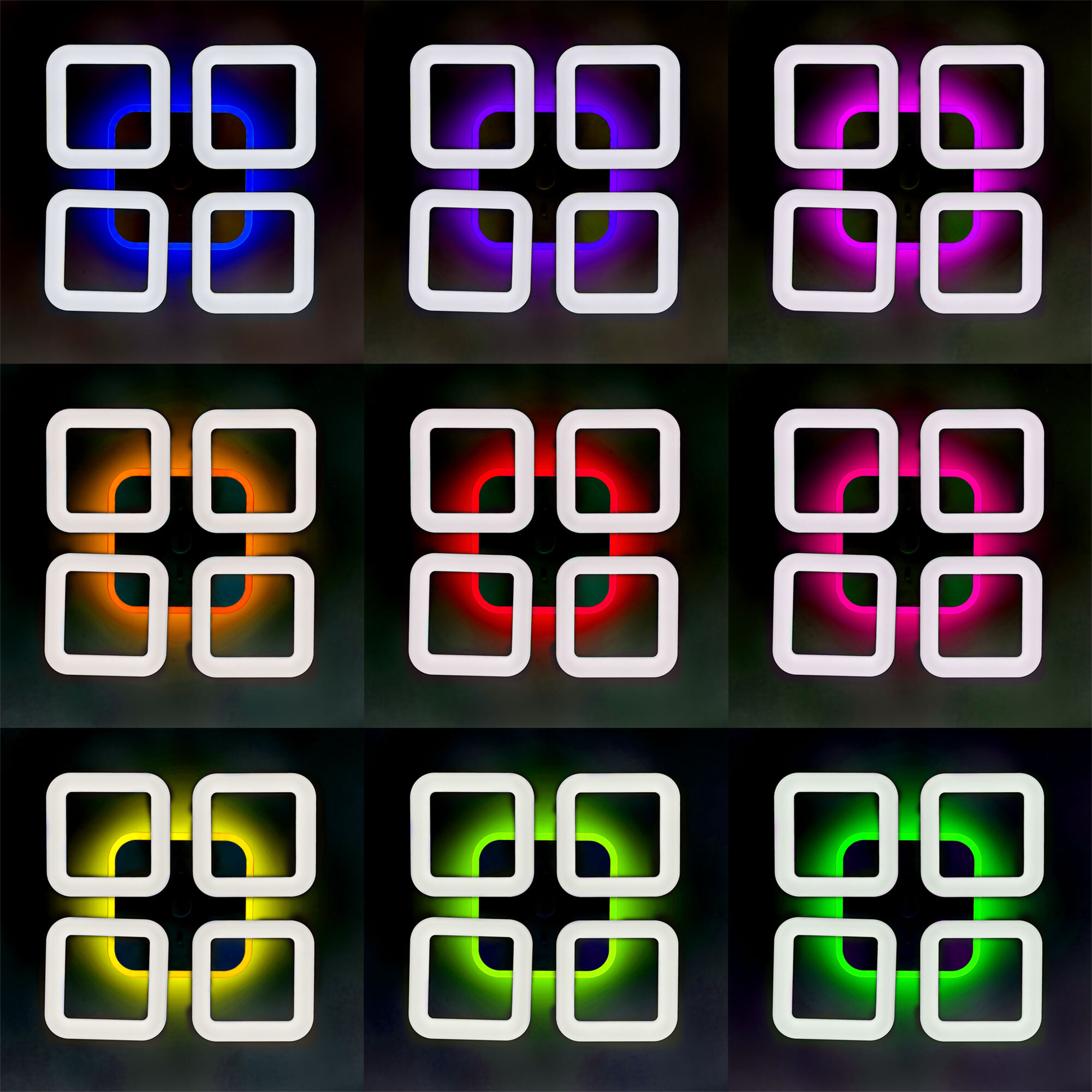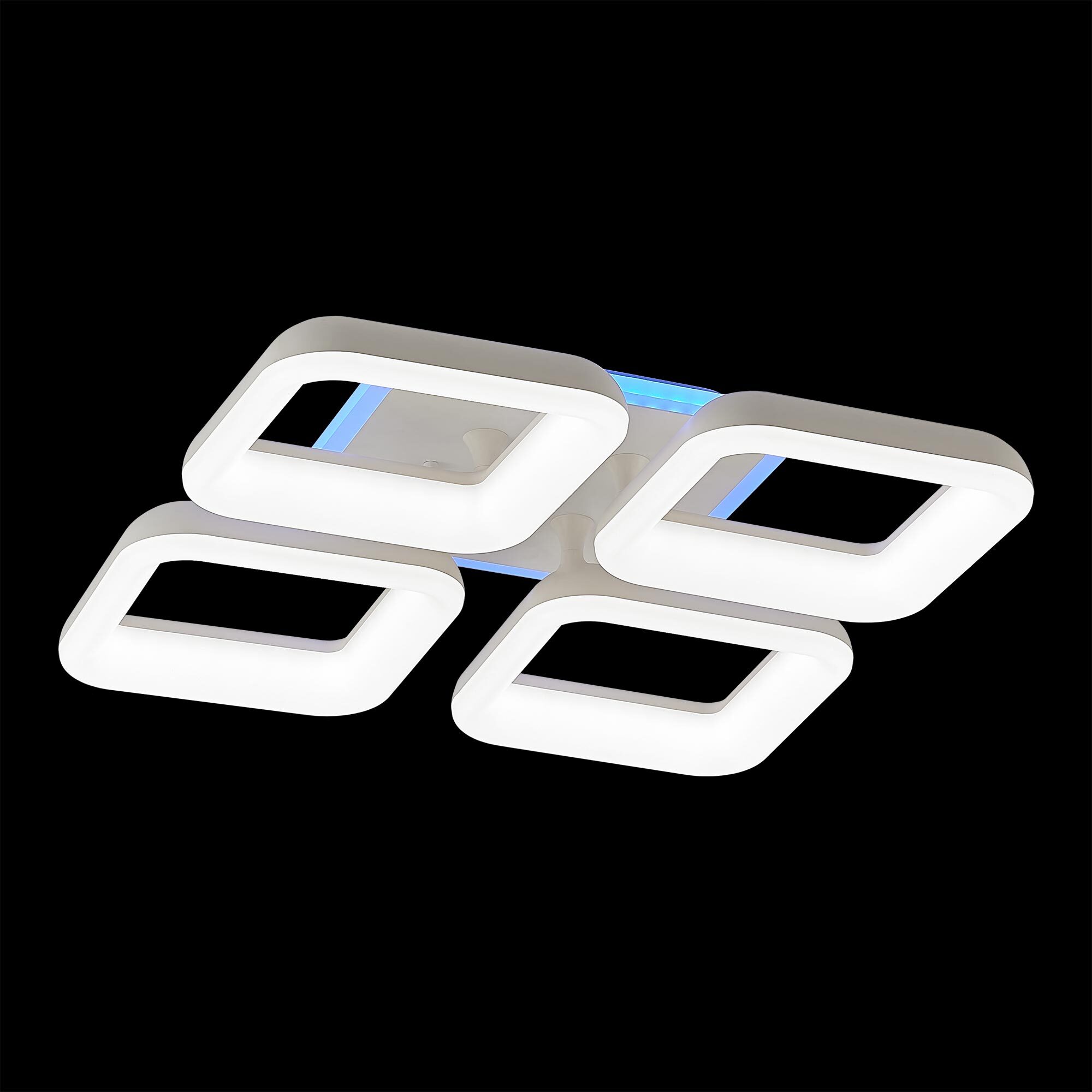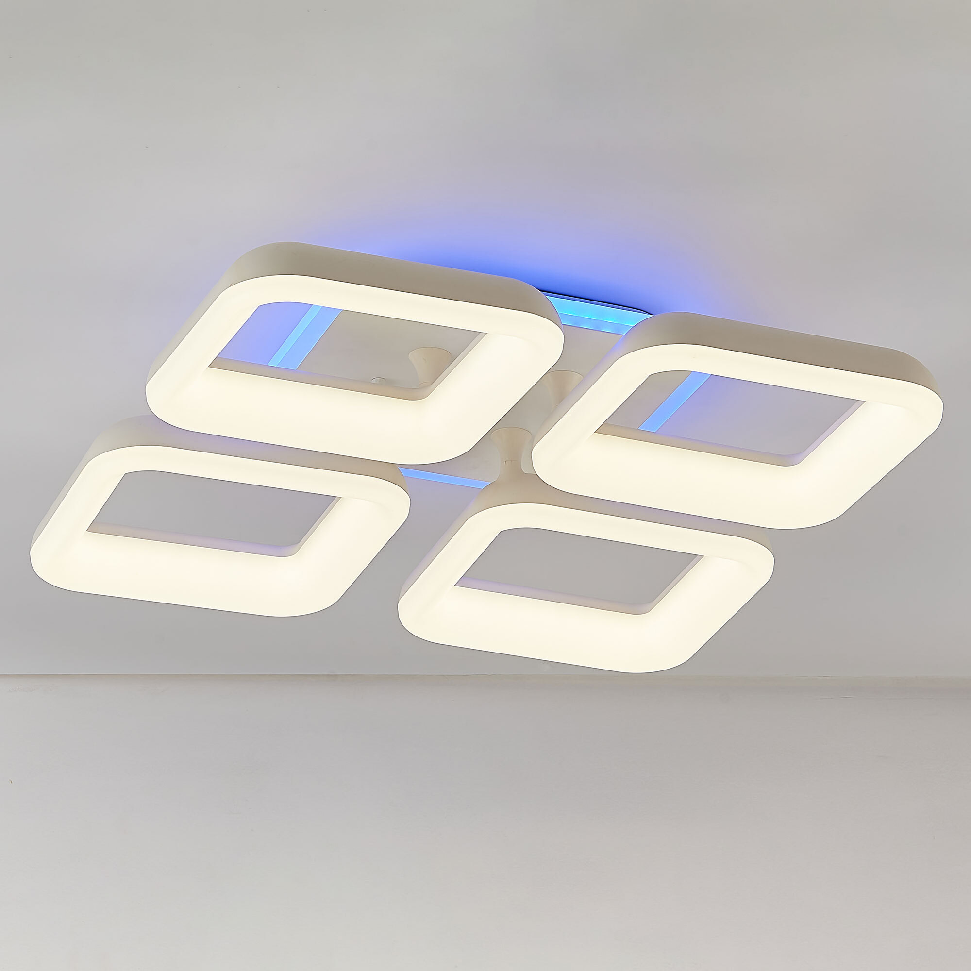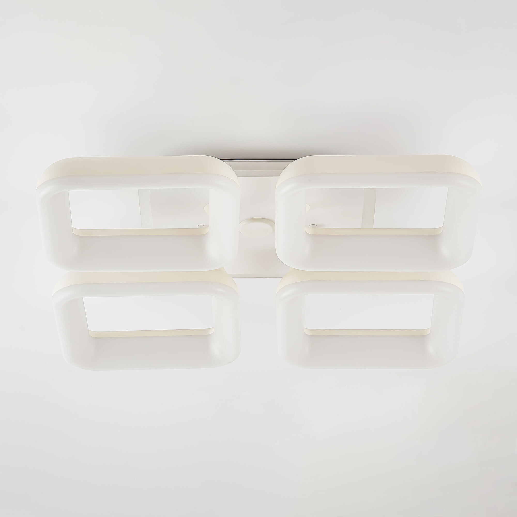 Светильник белый матовый, с квадратным основанием. Четыре светодиодных модуля плафона, формирующих внешний вид люстры, так же квадратной формы. Корпус плафонов белого цвета изготовлен из ударопрочного полимера, рассеиватель белый матовый из оптического полимера. Модель подходит для всех типов потолков, в том числе натяжных.