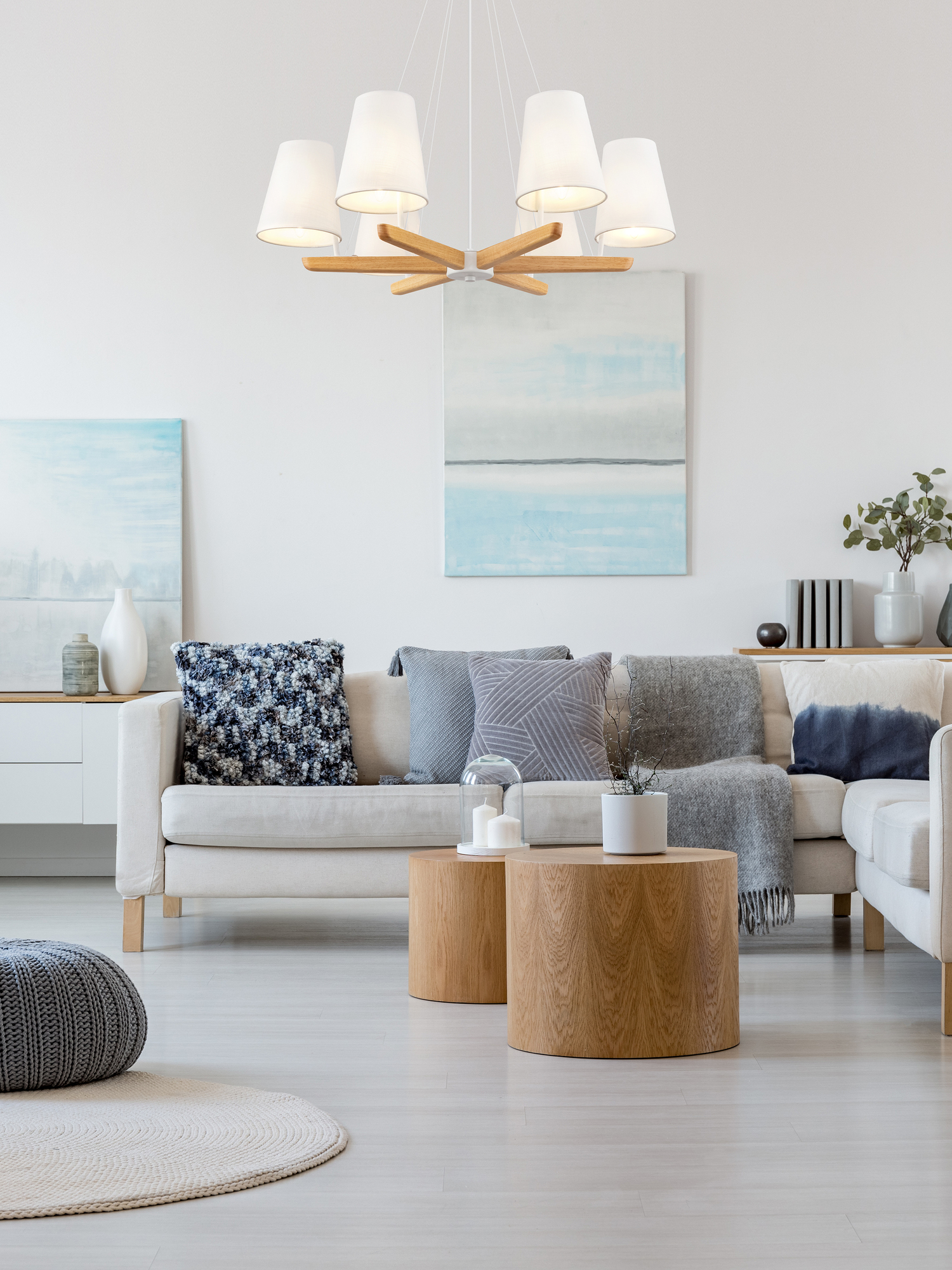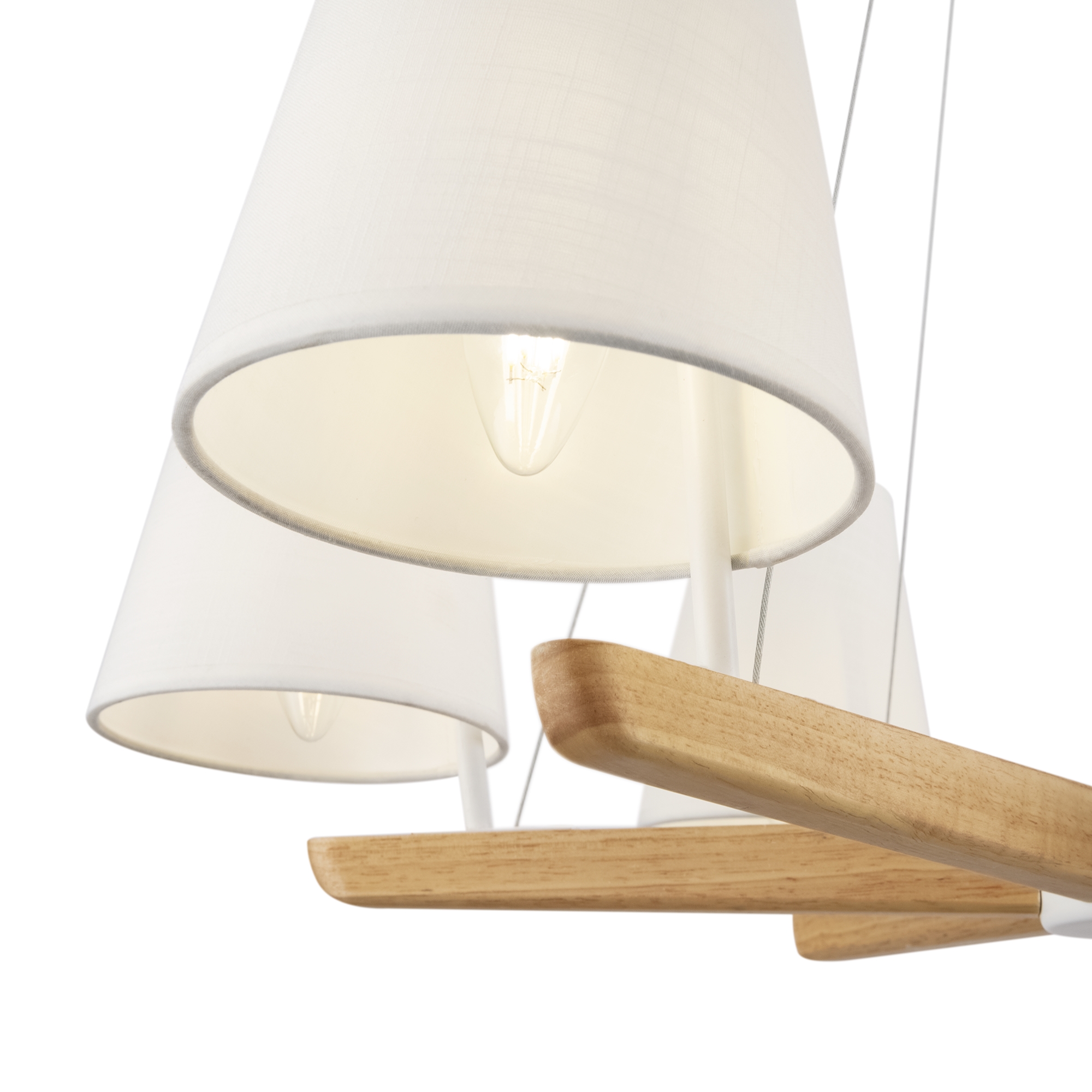 Материал арматуры – металл, цвет – белый. Абажуры из текстиля белого оттенка. Декоративные элементы из натурального дерева. Трендовый экодизайн. Источник света – лампа с цоколем E14.