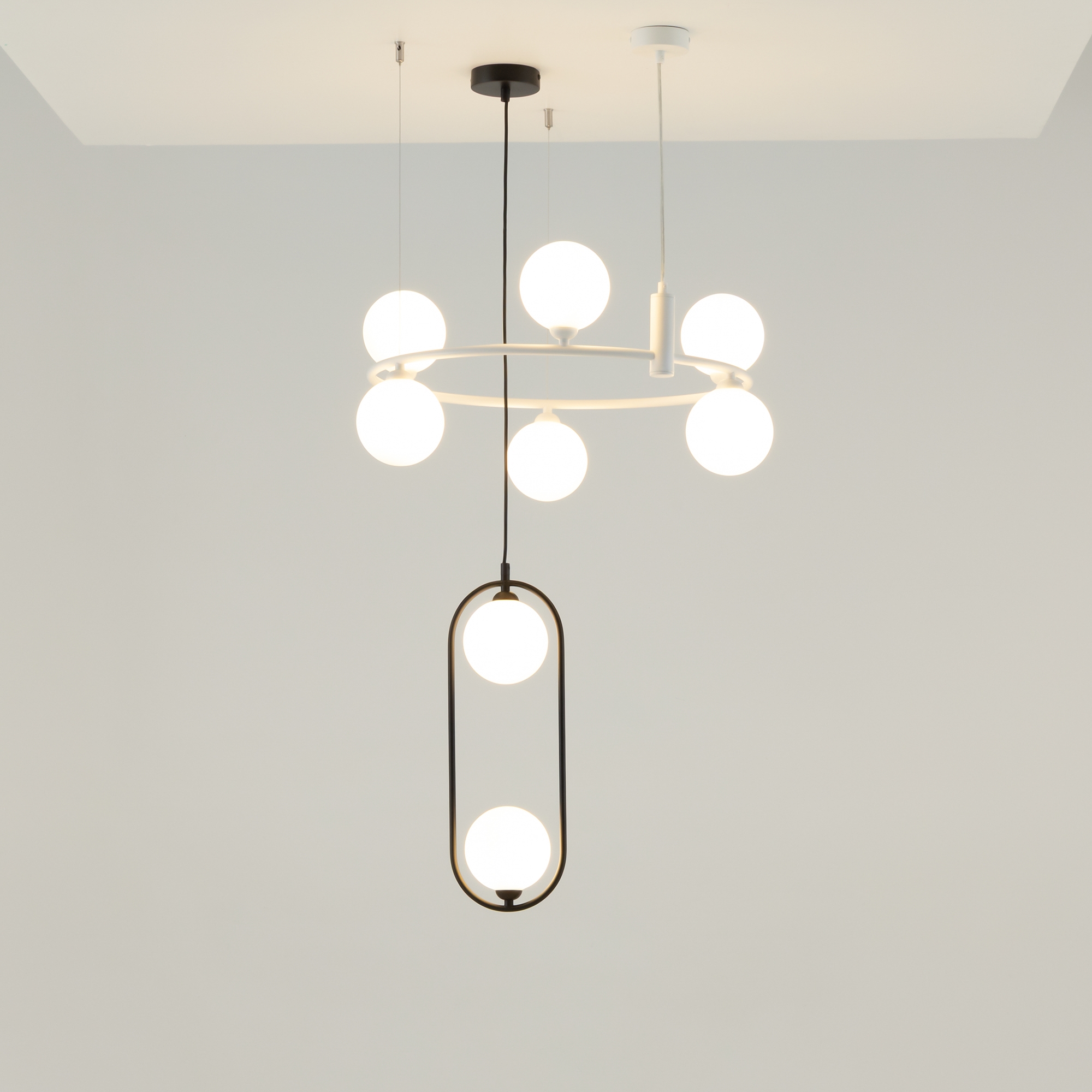 Арматура из металла в трех оттенках: белый, черный, латунь. Плафоны-сферы закреплены на округлом металлическом каркасе. Материал плафонов — выдувное стекло, цвет — белый. Высота подвесных моделей регулируется.
