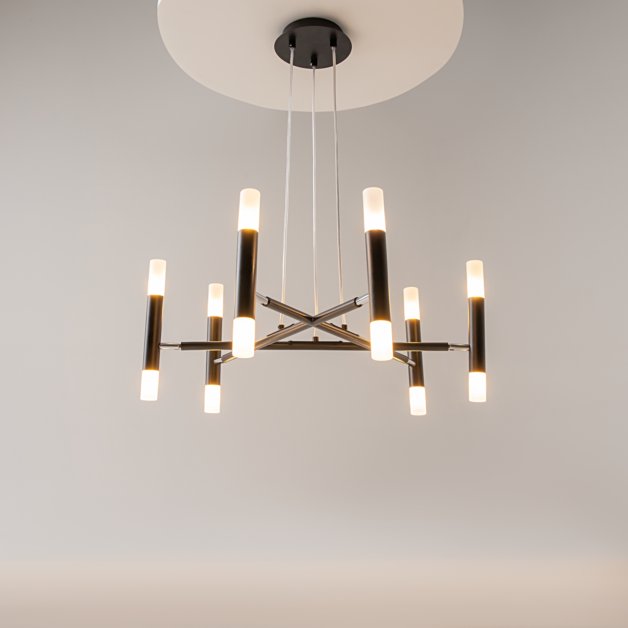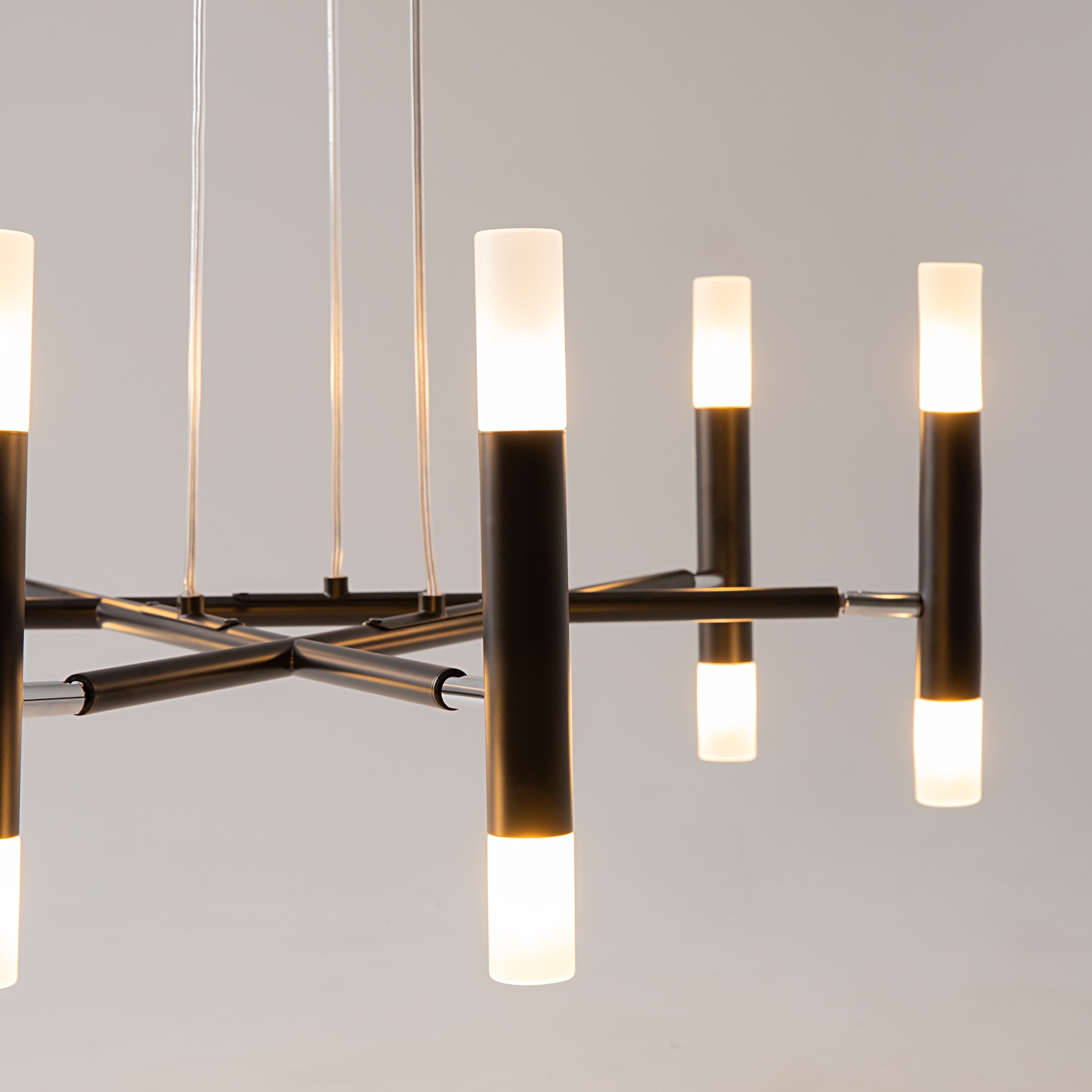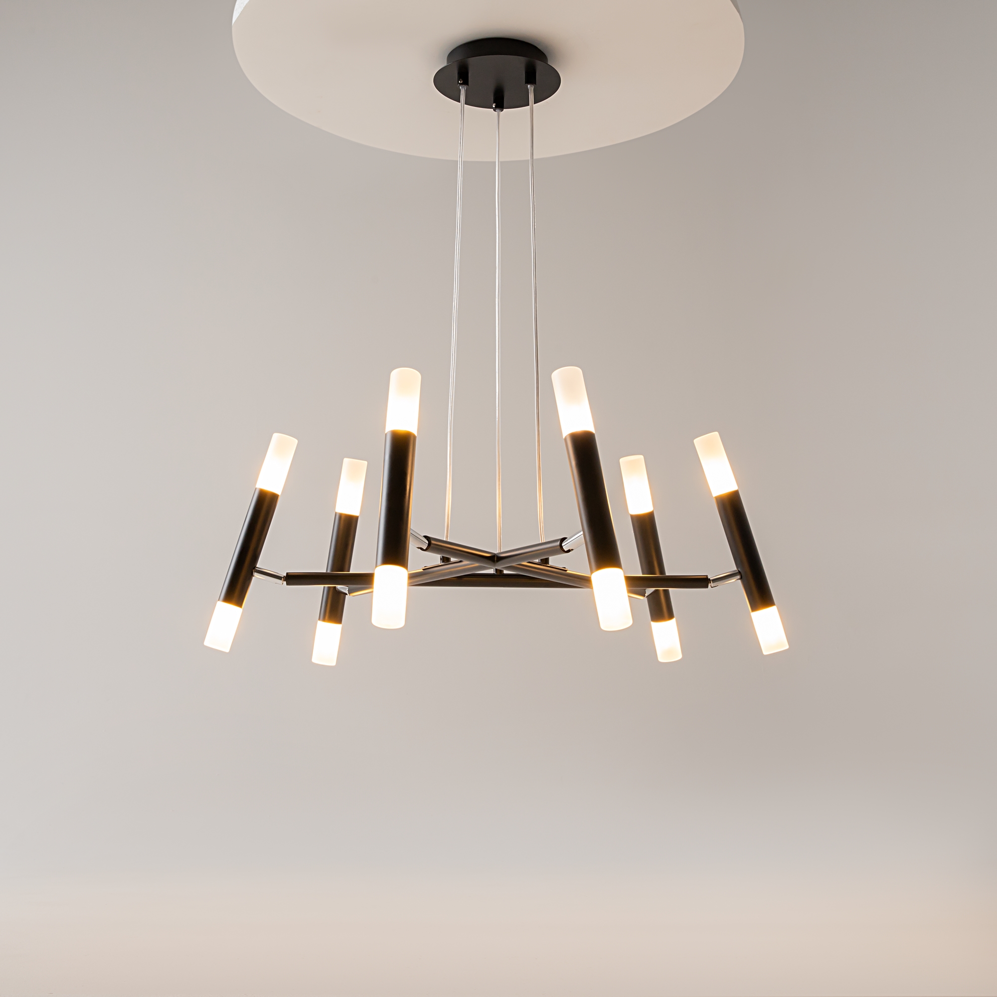 Металлическая арматура в матовом черном цвете. Цилиндрические плафоны вра щаются на 340° по горизонтали и 90° по вертикали. Возможность видоизменять дизайн светильника. Рассеиватель из матового стекла.
