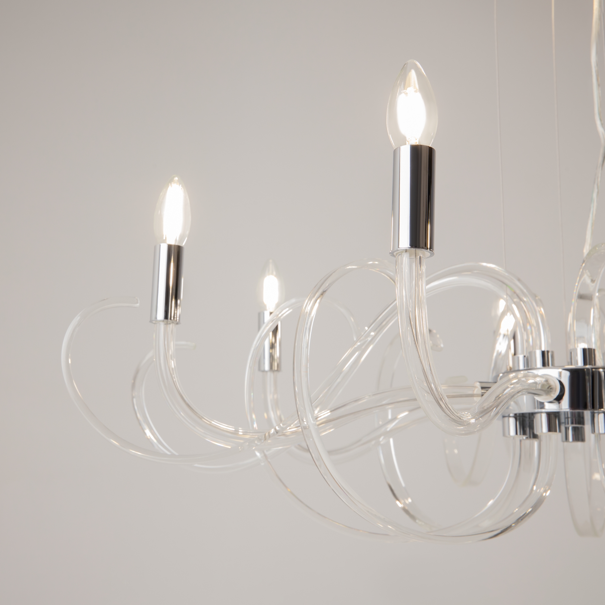 Материал арматуры – металл, цвет – хром. Декоративные рожки из прозрачного стекла. Трендовые обтекаемые формы в дизайне. Высота подвесных люстр регулируется тросом.