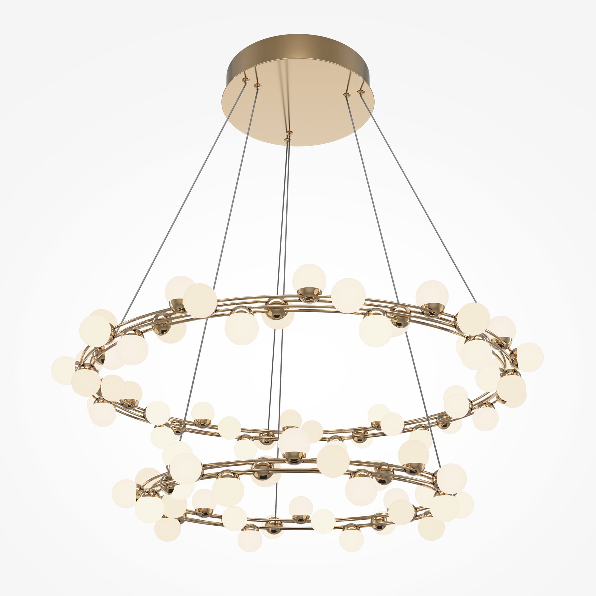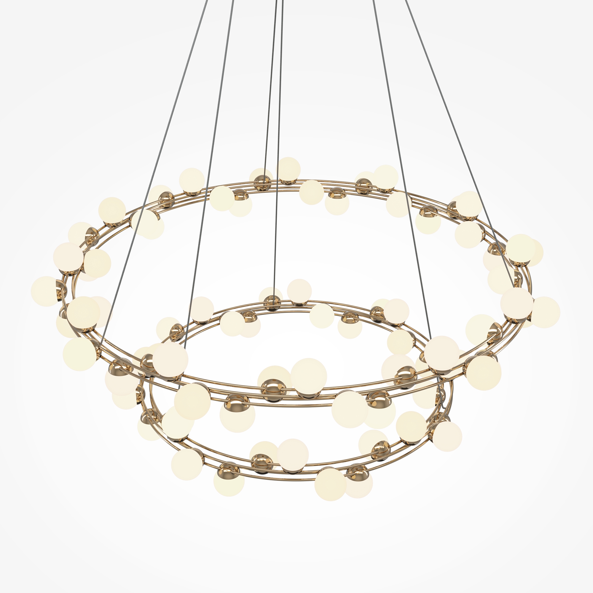 Арматура из металла в золотом цвете. Плафоны-сферы — белый пластик. Дизайн с имитацией молекулярной структуры. LED-источники света.