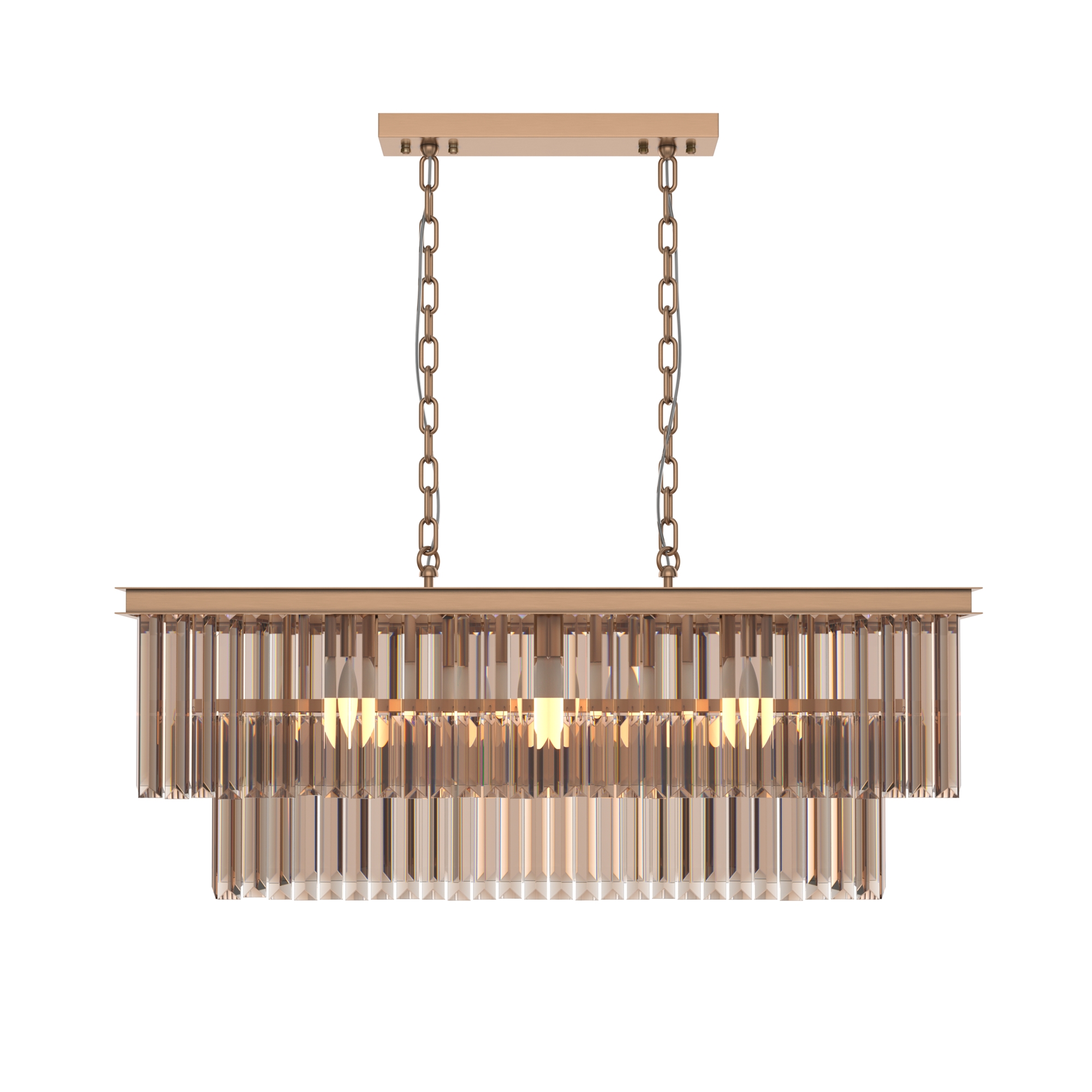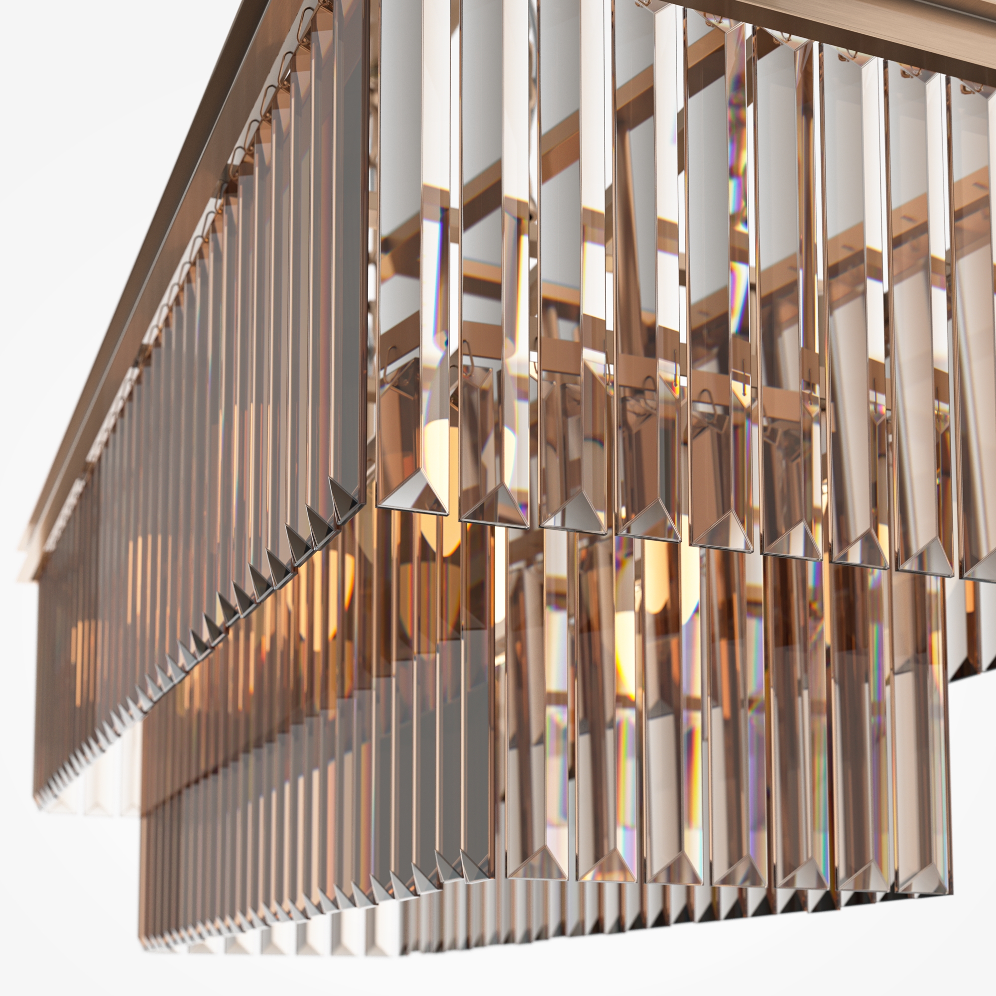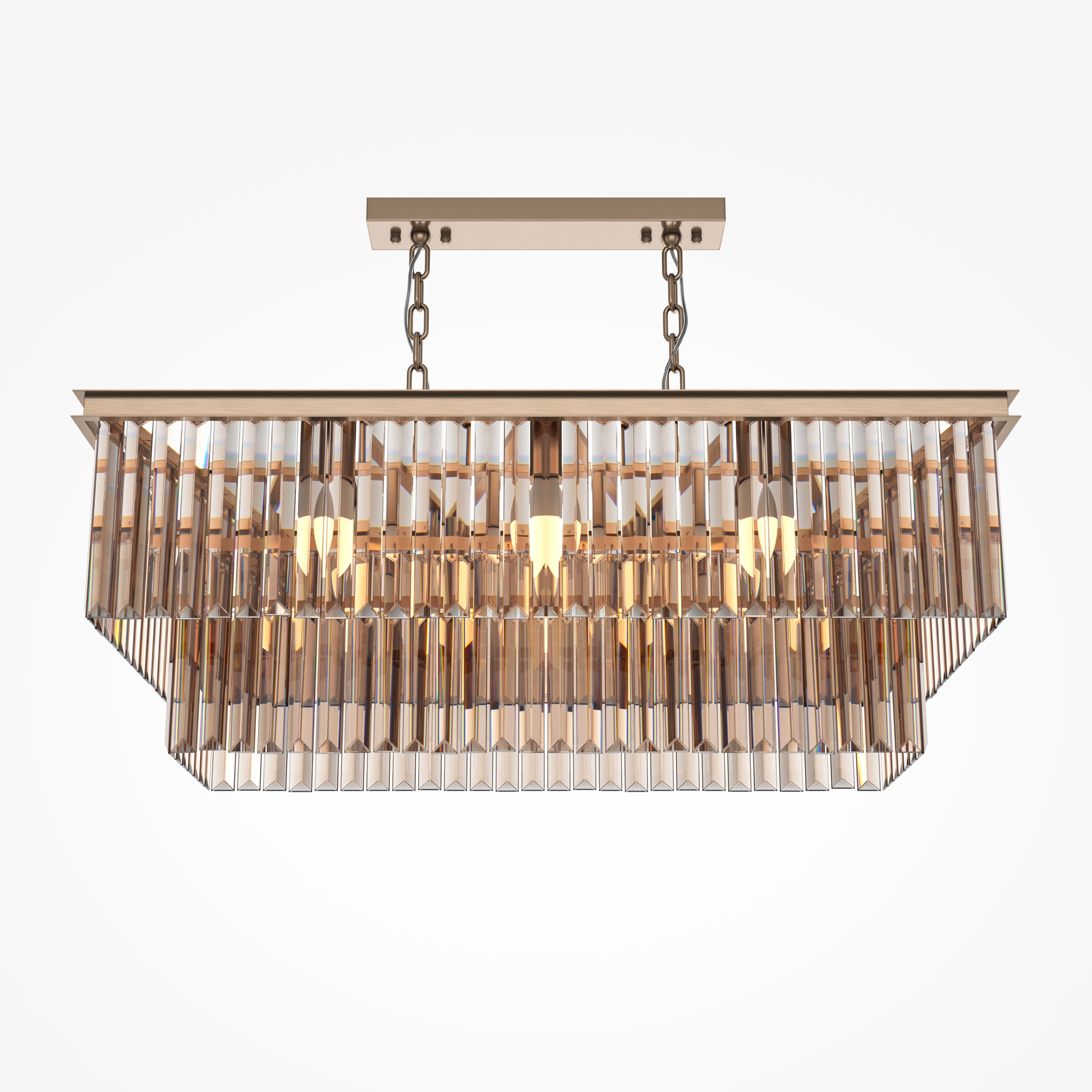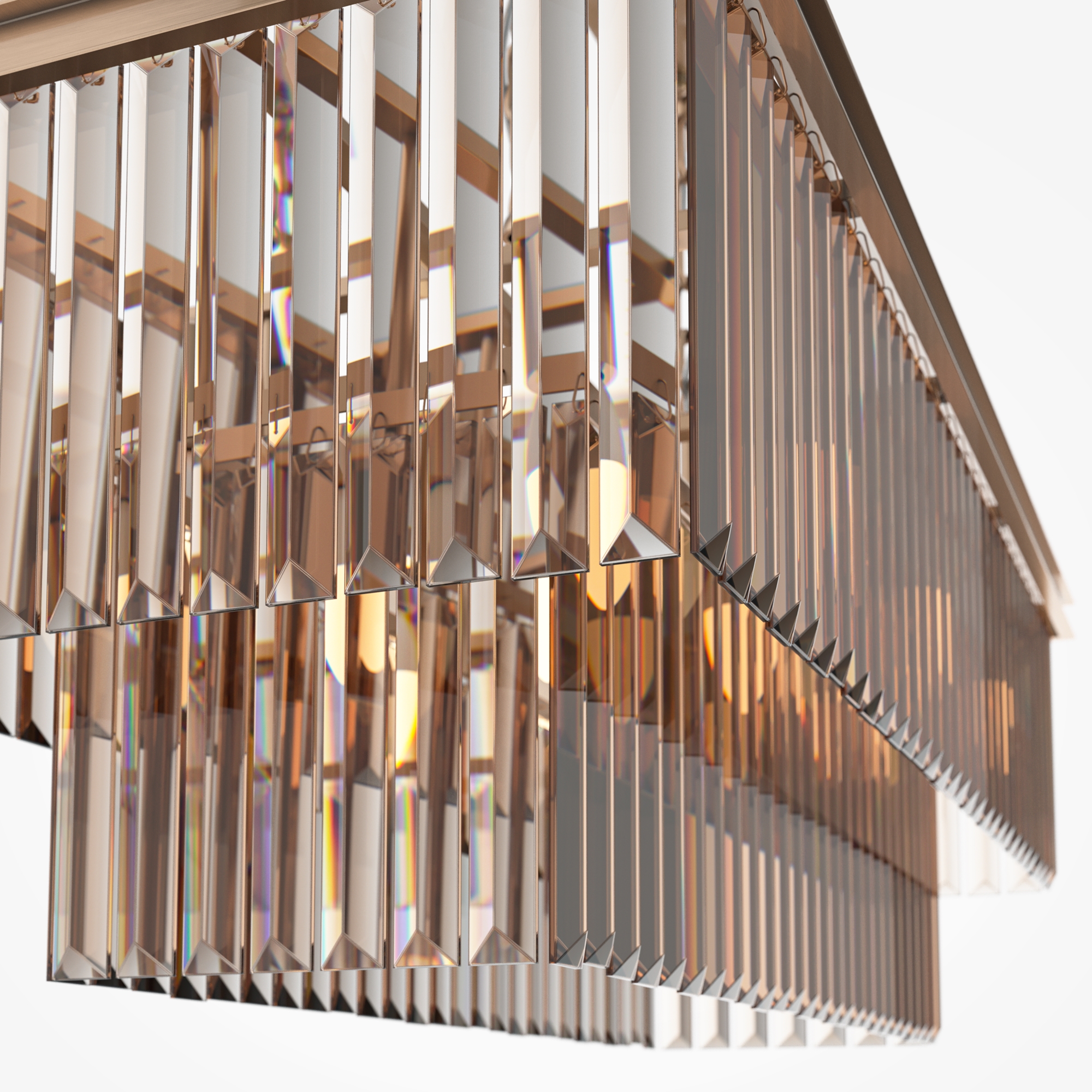 Арматура из металла в трех оттенках: латунь, хром, золото. Многоярусный декор. Подвески: прозрачное (арматура – хром, латунь) и янтарное (арматура – золото) стекло. Высота подвесных моделей регулируется.