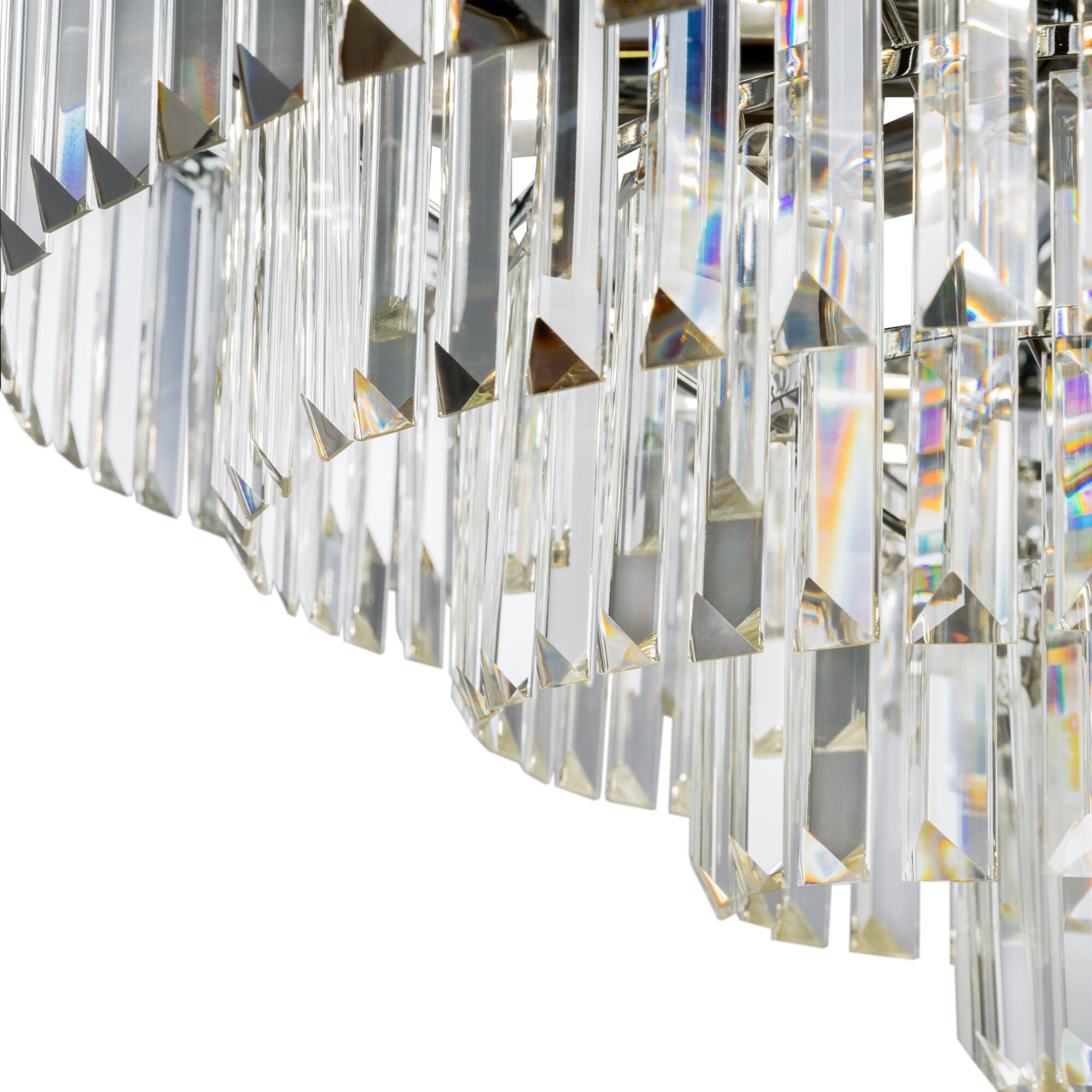 Арматура из металла в трех оттенках: латунь, хром, золото. Многоярусный декор. Подвески: прозрачное (арматура – хром, латунь) и янтарное (арматура – золото) стекло. Высота подвесных моделей регулируется.