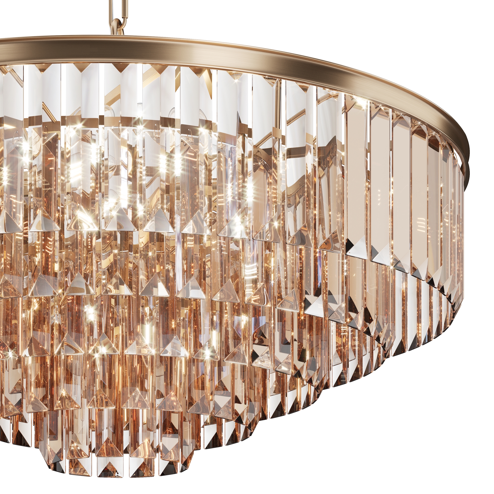 Арматура из металла в трех оттенках: латунь, хром, золото. Многоярусный декор. Подвески: прозрачное (арматура – хром, латунь) и янтарное (арматура – золото) стекло. Высота подвесных моделей регулируется.
