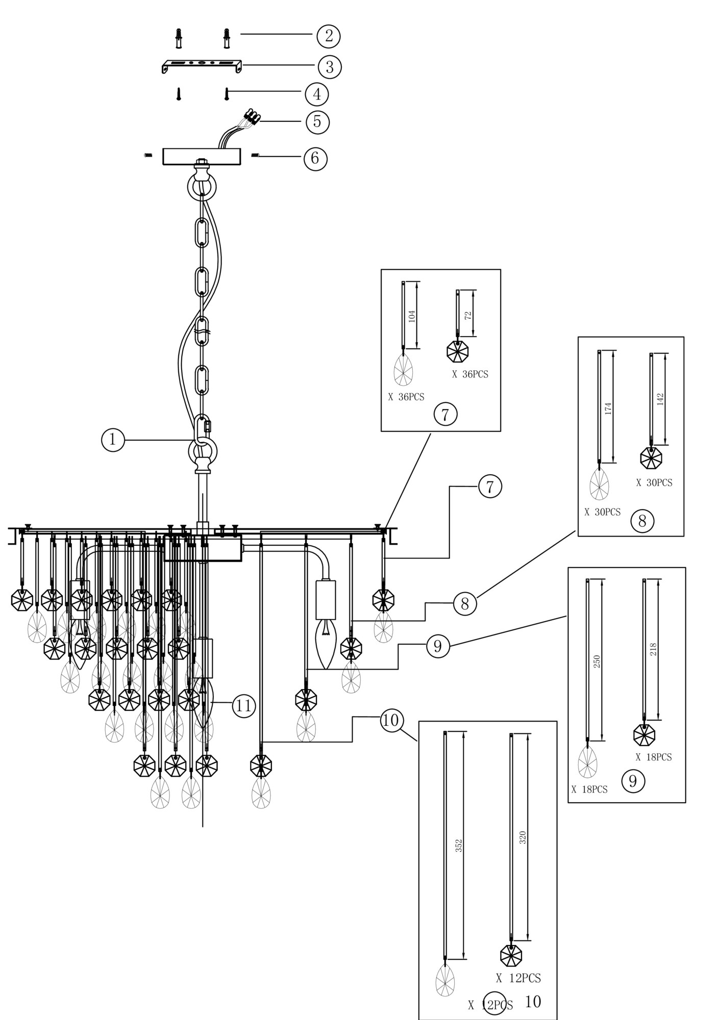 Материал арматуры – металл, оттенки – золото и хром. Комбинация металла и хрусталя в декоре. Металлические трубки гальванизированы в тон арматуре. Хрустальные подвески обрамляют композицию. Высота люстр регулируется с помощью цепи. Цоколь Е14.