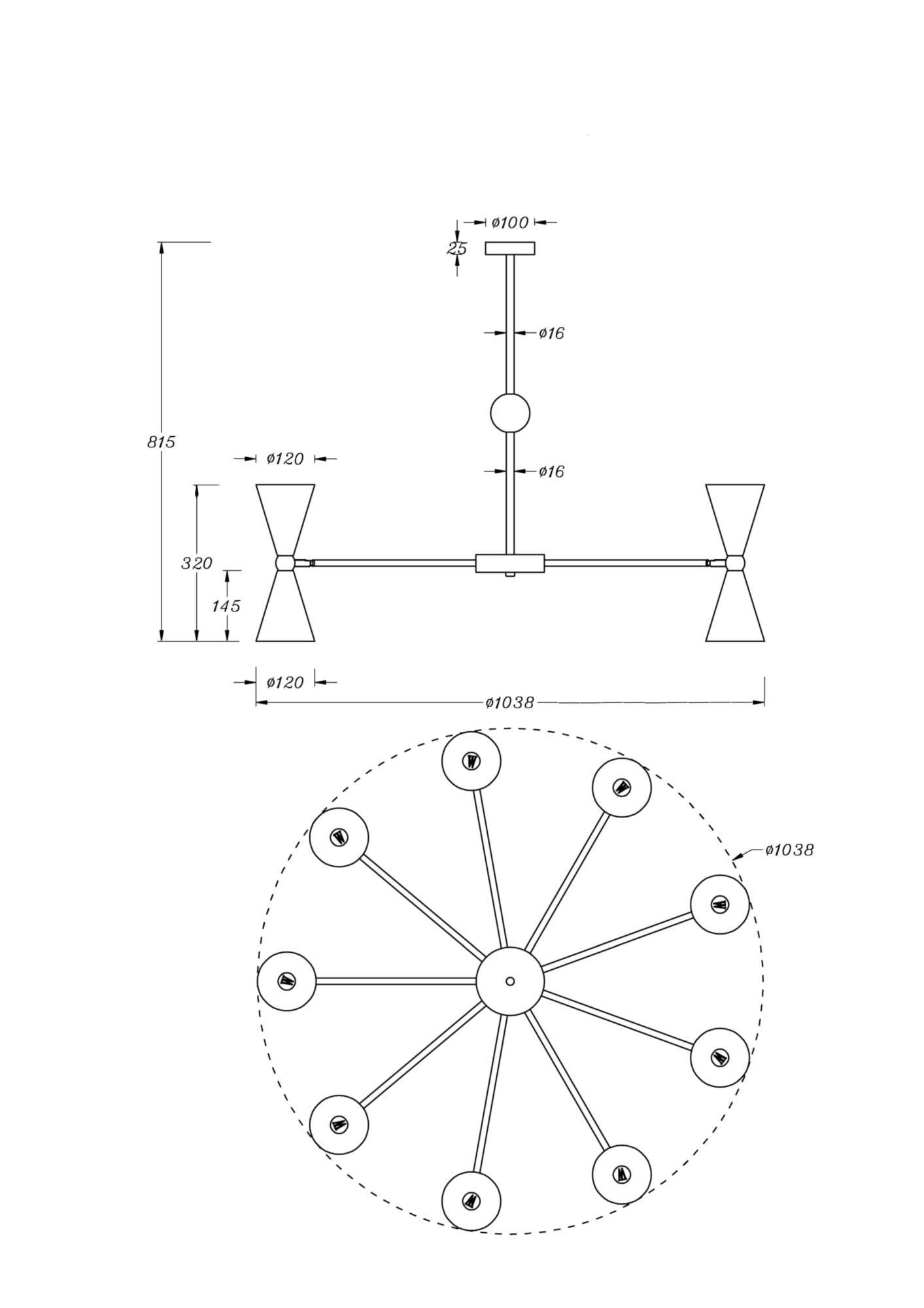 Материал арматуры - металл, оттенок – золото. Металлические плафоны изнутри окрашены в золотой цвет. Внешняя сторона в двух вариантах оттенков: черный и белый. Поворотный механизм, рожки вращаются.