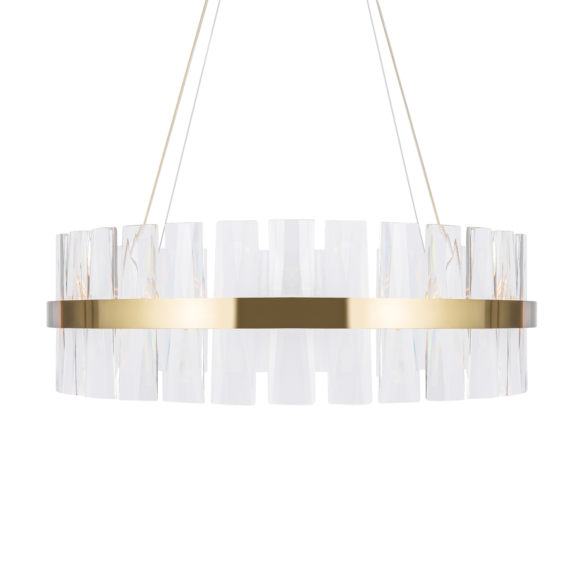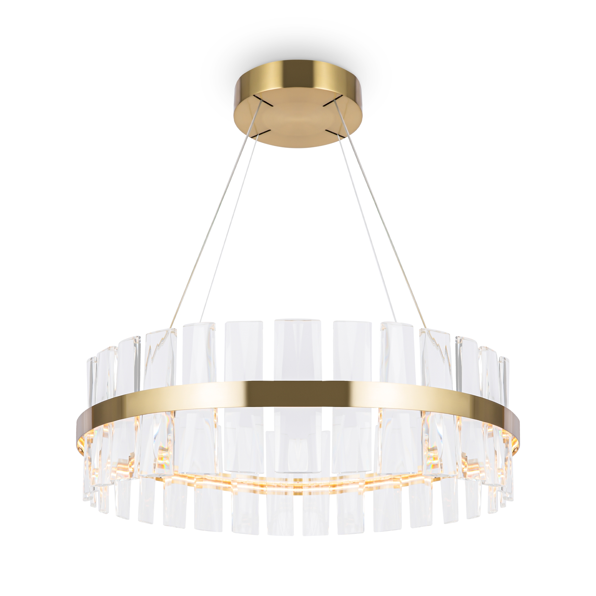 МатМатериал арматуры - металл, цвет - латунь. Декор - объемные прозрачные хрустальные элементы с чередующимся рисунком. LED источник света, цветовая температура - 3000К. Регулируемая длина тросов.