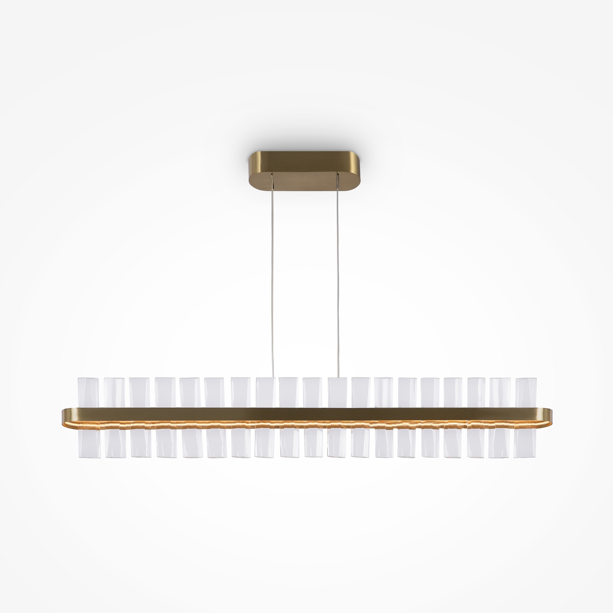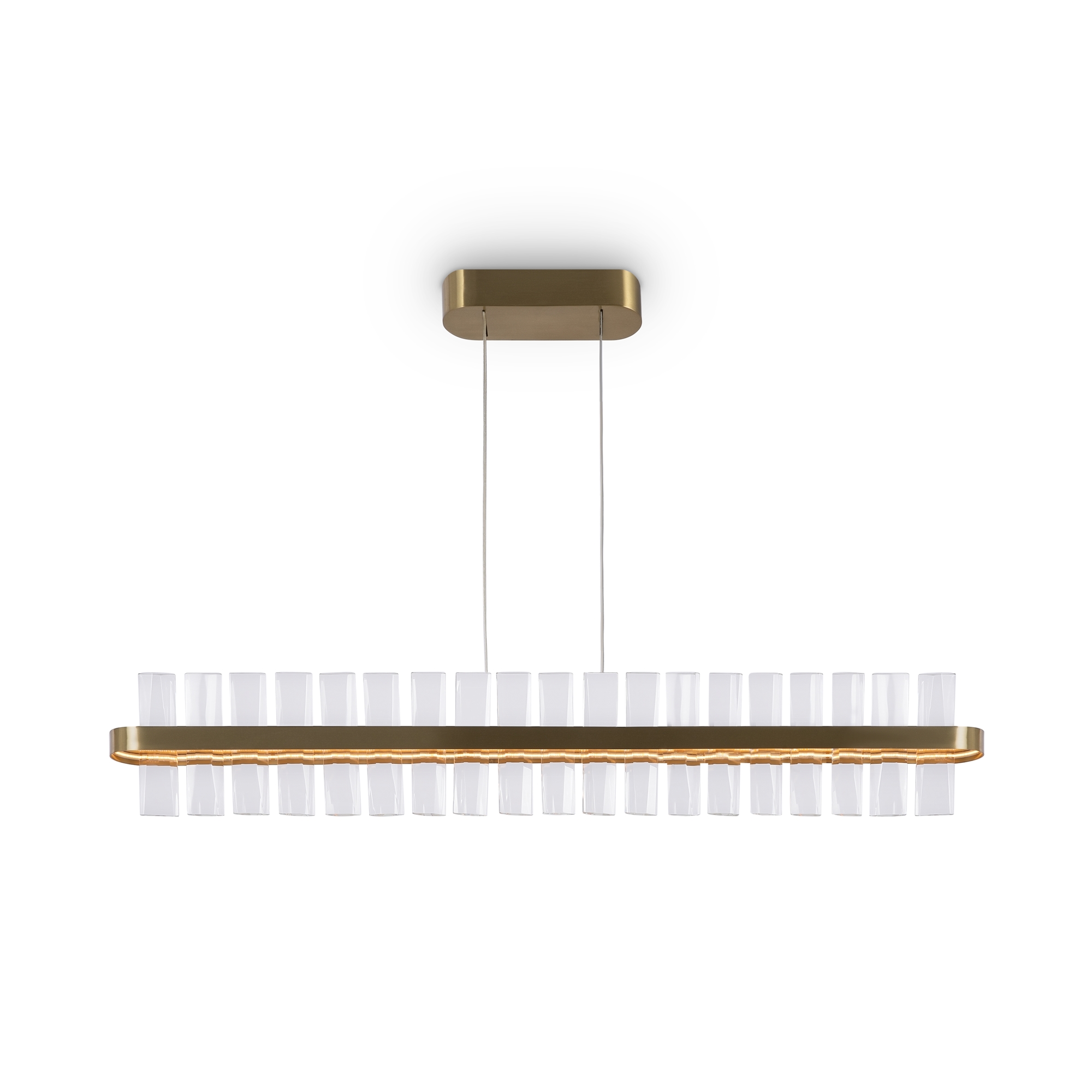 МатМатериал арматуры - металл, цвет - латунь. Декор - объемные прозрачные хрустальные элементы с чередующимся рисунком. LED источник света, цветовая температура - 3000К. Регулируемая длина тросов.
