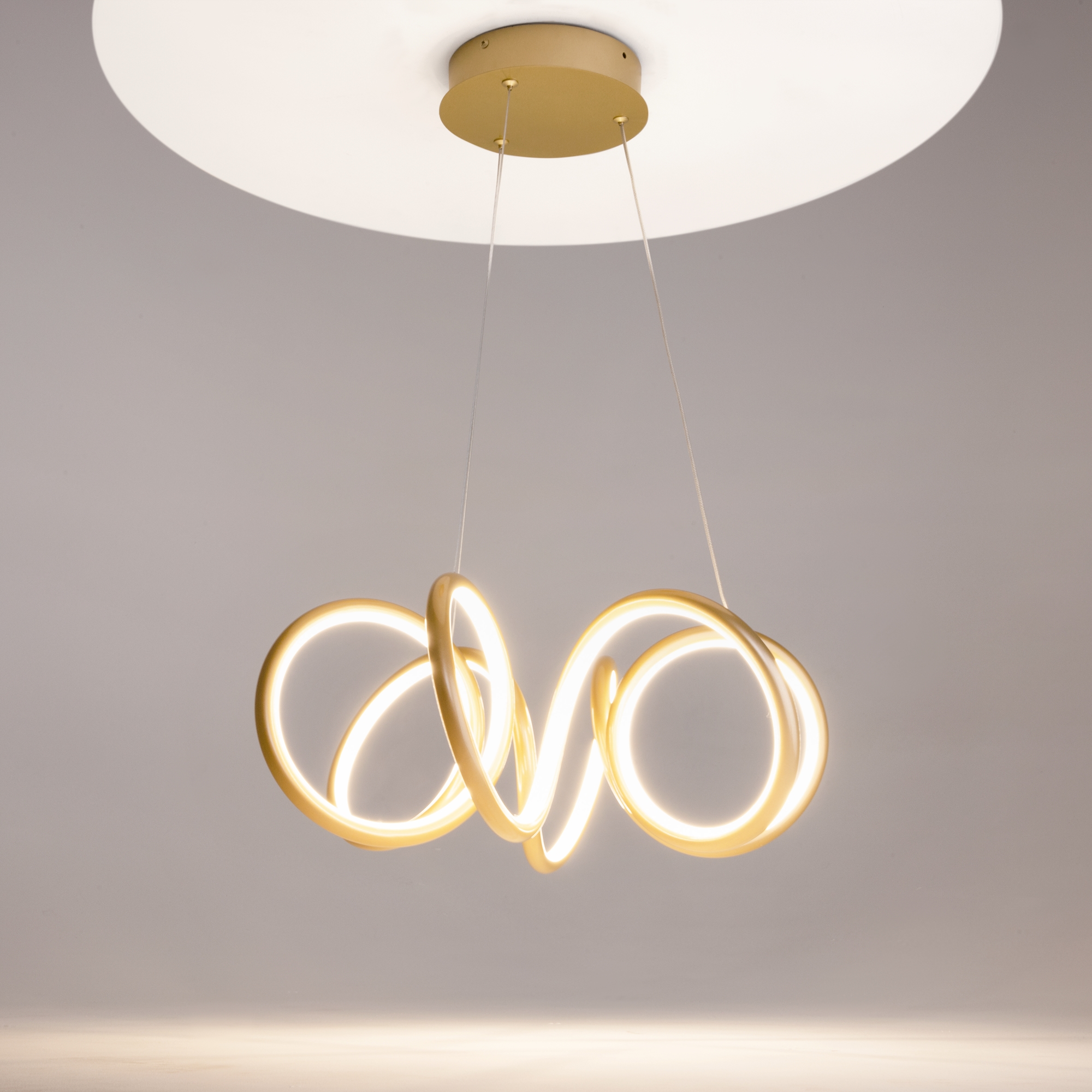 Металлическая арматура, цвета - черный, латунь. Закругленные световые элементыиз силикона со встроенным LED-источником света по всему периметру. Регулируемый диапазон цветовой тмепературы 2600К-3500К для светильников в латуни и 3000К-4000К для черных. Регулируема длина тросов. Фантазийный образ хаотичных фрагментов свободно парящих в пространстве.